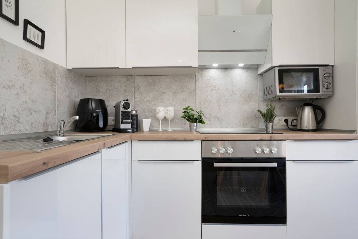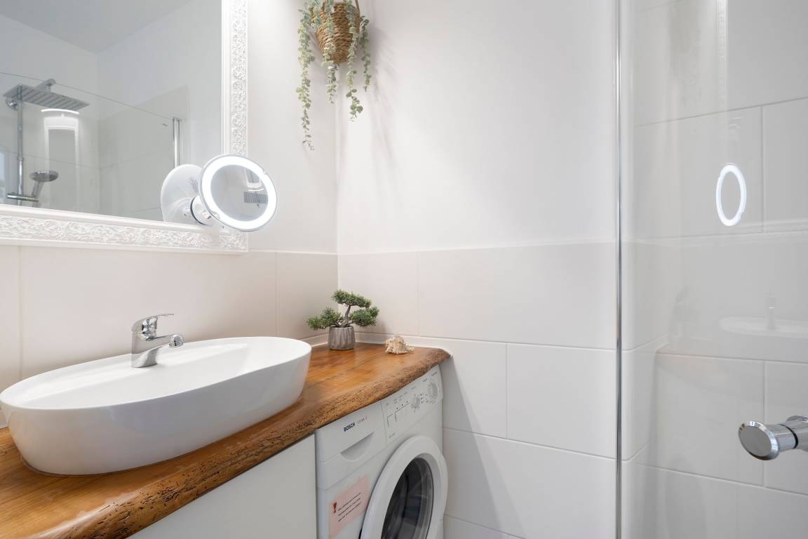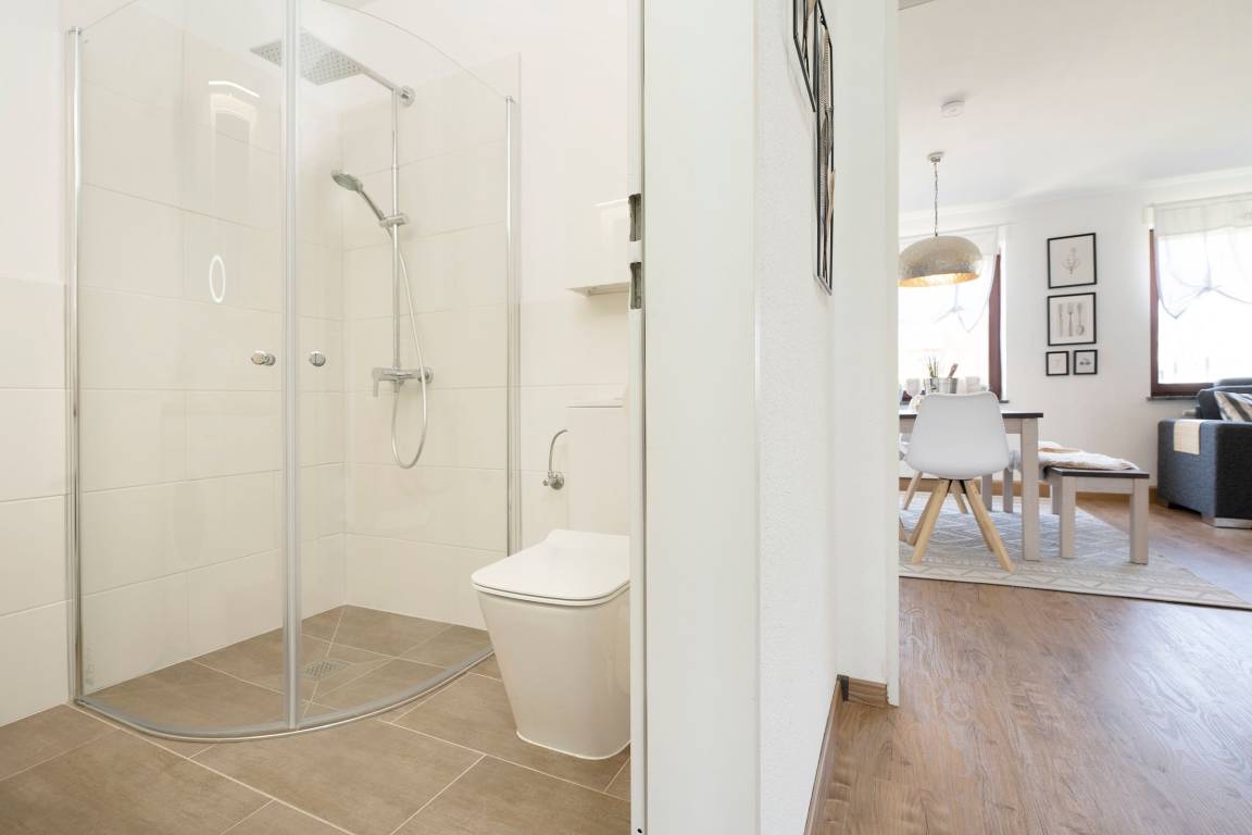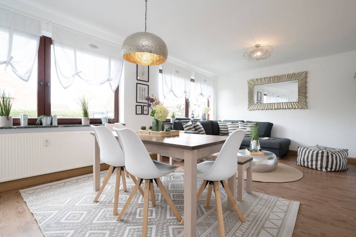 Durch einen kleine Flur gelangen Sie in den geschmackvoll eingerichteten Wohn-, Ess- und Kochbereich. In der gut ausgestatteten Küche können Sie sich austoben, falls Sie mal keine Lust haben, in die umliegenden Restaurants zu essen. Am großen Esstisch sind Sie dann ganz für sich und können ausgiebig über die möglichen Aktivitäten für den kommenden Urlaubstag sprechen. Das gemütliche Sofa ist nicht nur der perfekte Platz für spannende Fernsehabende sondern verwandelt sich zur Nacht auch in eine bequeme Schlafstätte (ca. 150x230 cm). Das separate Schlafzimmer mit Doppelbett (ca. 2x 80x200 cm) und Kleiderschrank liegt direkt nebenan. Zusätzlich verfügt die Wohnung über einen kleinen separaten kuscheligen Rückzugsort mit einem Kojenbett (ca. 120x200 cm) und eigenem Fernseher. Auch das helle Badezimmer mit ebenerdiger Dusche und Waschmaschine wird Sie begeistern. Auf der Terrasse können Sie lauschige Abende bei einem guten Glas Wein ausklingen lassen.
