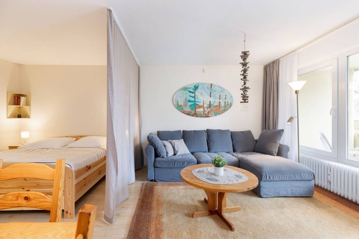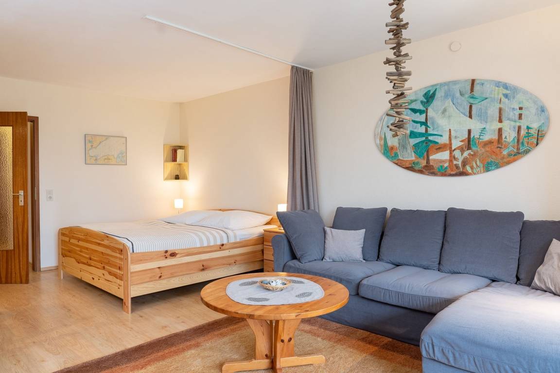 Durch einen Flur gelangen Sie in das helle Wohnzimmer mit gemütlicher Couch und großem Doppelbett (2x 90x200 cm), das räumlich durch einen Vorhang abgetrennt werden kann.