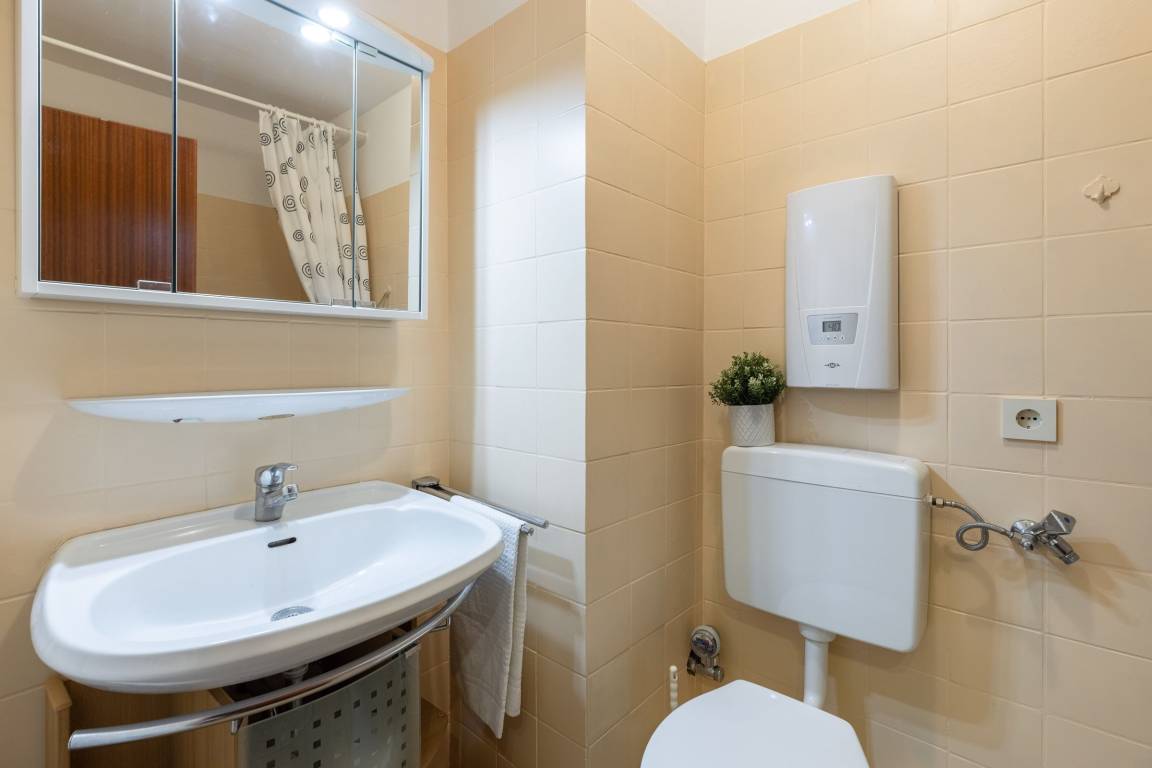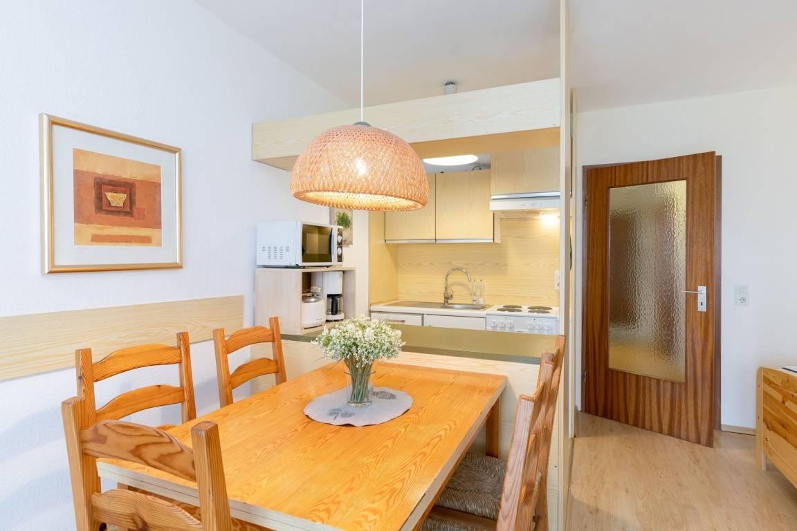 In der angrenzenden, offenen Küche, die mit allen Annehmlichkeiten ausgestattet, können Sie Ihre Mahlzeiten zubereiten und diese am Essplatz gemeinsam einnehmen. Vom Wohnbereich haben Sie Zugang zum möblierten, überdachten Balkon. Im zusätzlichen Schlafzimmer stehen ein Etagenbett für die Kinder (2x 90x200 cm) und ein weiteres Einzelbett (90x200 cm) bereit. Das innenliegende Bad ist mit Badewanne und Föhn ausgestattet.