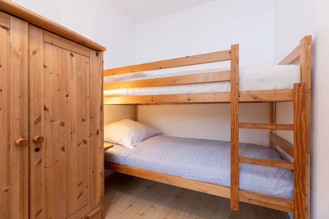 Schlafzimmer: 1 Einzelbett (90x200 cm), 1 Etagenbett (2x 90x200cm, nur Kinder), Kleiderschrank, Verdunkelung: Gardine