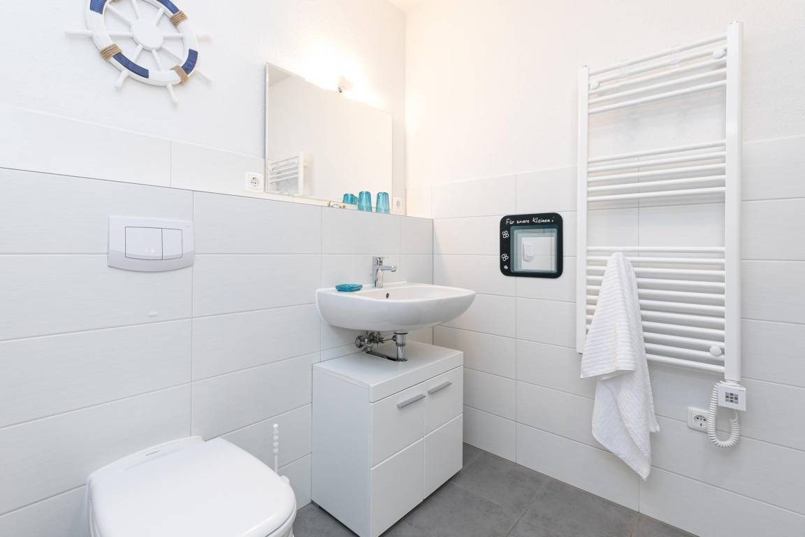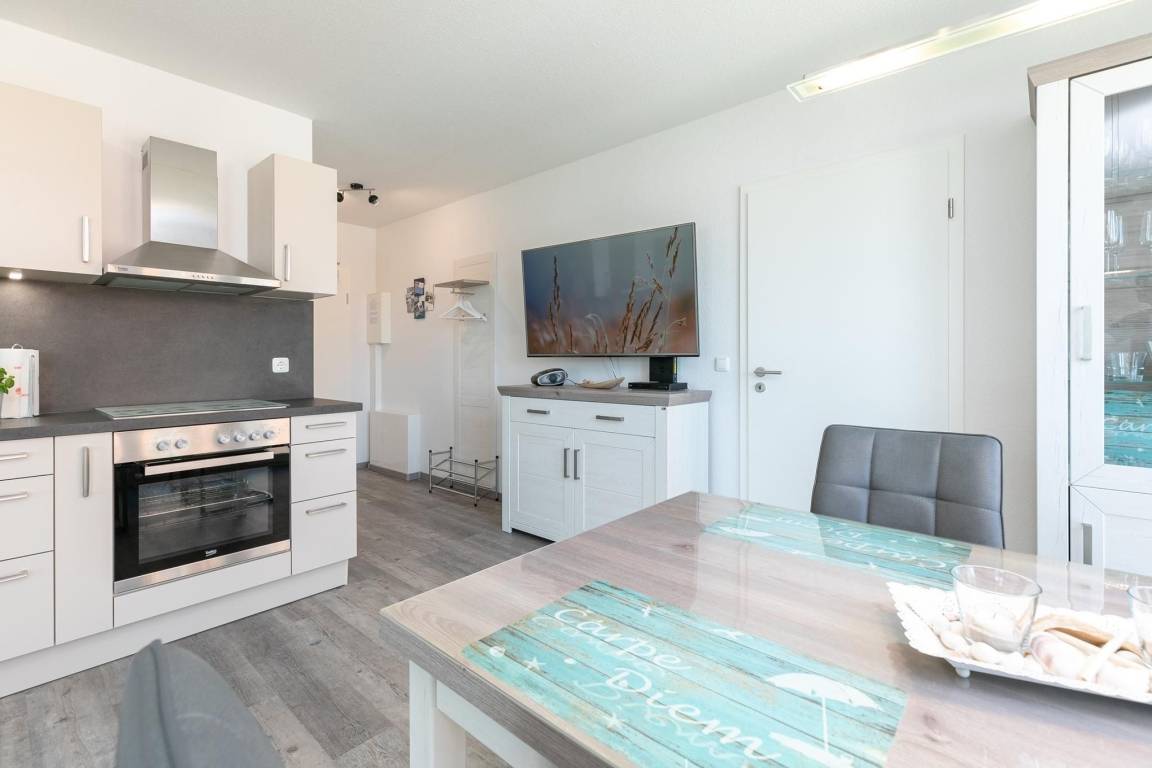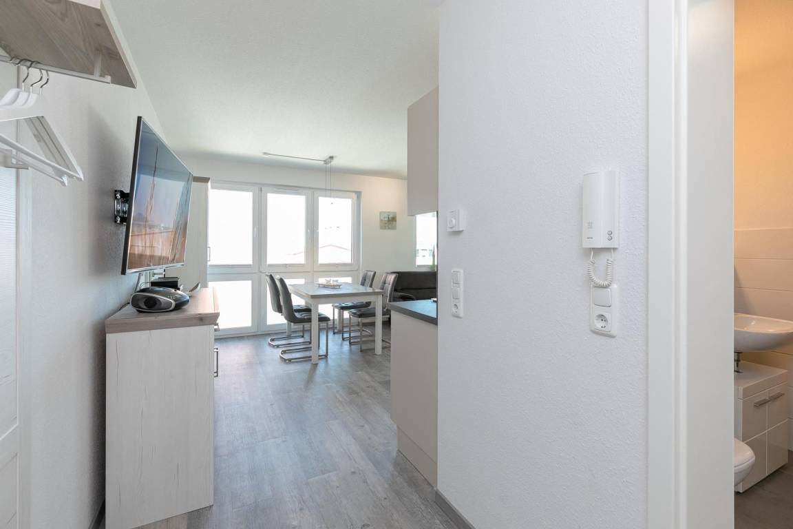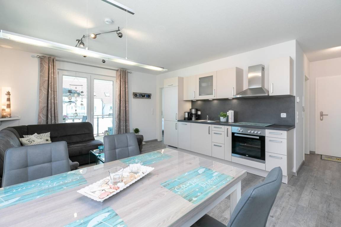Die neu erbaute Wohnanlage Ostseedomizil in Kellenhusen verspricht pures Urlaubsvergnügen. Die modern ausgestattete Ferienwohnung OSTWIND präsentiert sich freundlich und hell: Kommen Sie herein in den gemütlichen Wohn-/Essbereich und nehmen Sie in der kuscheligen Sofa-Landschaft Platz. Die großen Fenster lassen viel Sonnenlicht herein – aber das schöne Wetter können Sie natürlich auch direkt auf dem großen überdachten Balkon (Nord-Ost-Lage) genießen. Das wird bestimmt Ihr neuer Lieblingsplatz – denn selbst wenn es draußen mal nicht so richtig warm ist, sitzen Sie hier schön geschützt. Vielleicht mit einem guten Buch? In der offenen Küche mit Spülmaschine können Sie nach Herzenslust Ihre Menüs zubereiten. Gegessen wird in der schicken Ess-Ecke, genießen Sie unbeschwert Ihre Auszeit. Angenehme Nachtruhe versprechen die beiden Schlafräume: Ein Zimmer verfügt über ein Doppelbett (2x 90x200 cm). Das Besondere ist: Von hier aus haben Sie auch Zutritt auf den Balkon. In dem anderen Schlafzimmer stehen 2 Einzelbetten (je 90x200 cm). In beiden Schlafräumen befindet sich jeweils ein zusätzliches TV-Gerät. Das komfortable Duschbad verfügt über einen Handtuchwärmer und eine Waschmaschine. Praktisch ist der Fahrstuhl im Haus.