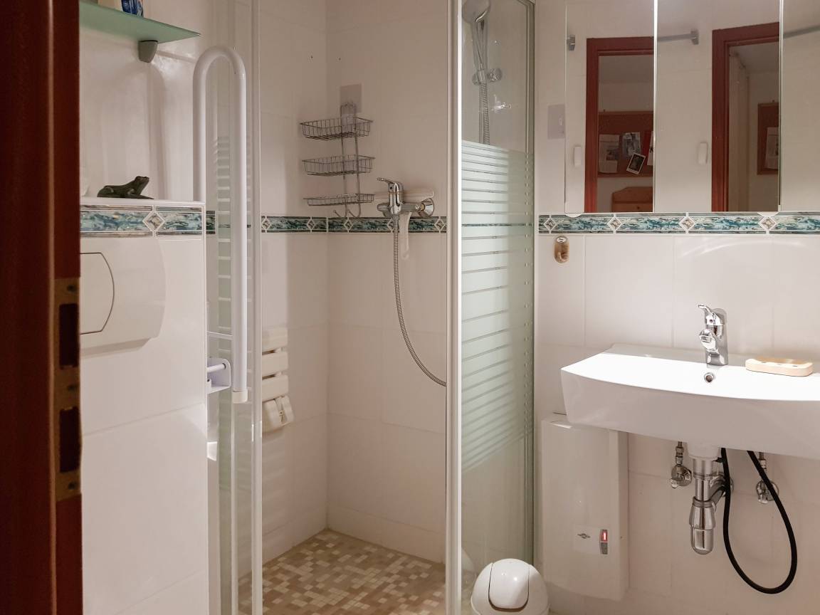 Im Badezimmer befindet sich eine Dusche und WC.