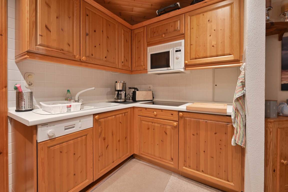 Das Wohnzimmer verfügt über eine gemütliche Couch, Couchtisch, TV-Möbel mit Flachbild-TV, Essbereich mit 4 Stühlen, integrierte Küchenzeile sowie Zugang zum möblierten Balkon.