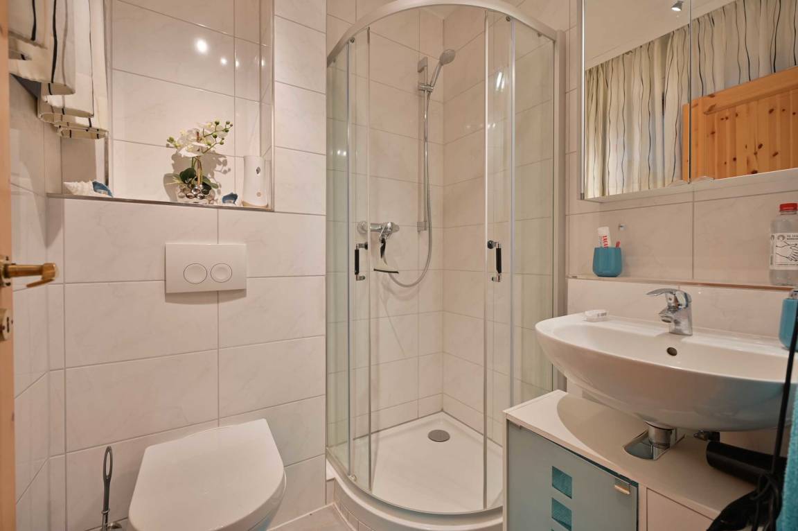 Das Badezimmer ist mit Dusche, Waschbecken und WC eingerichtet.