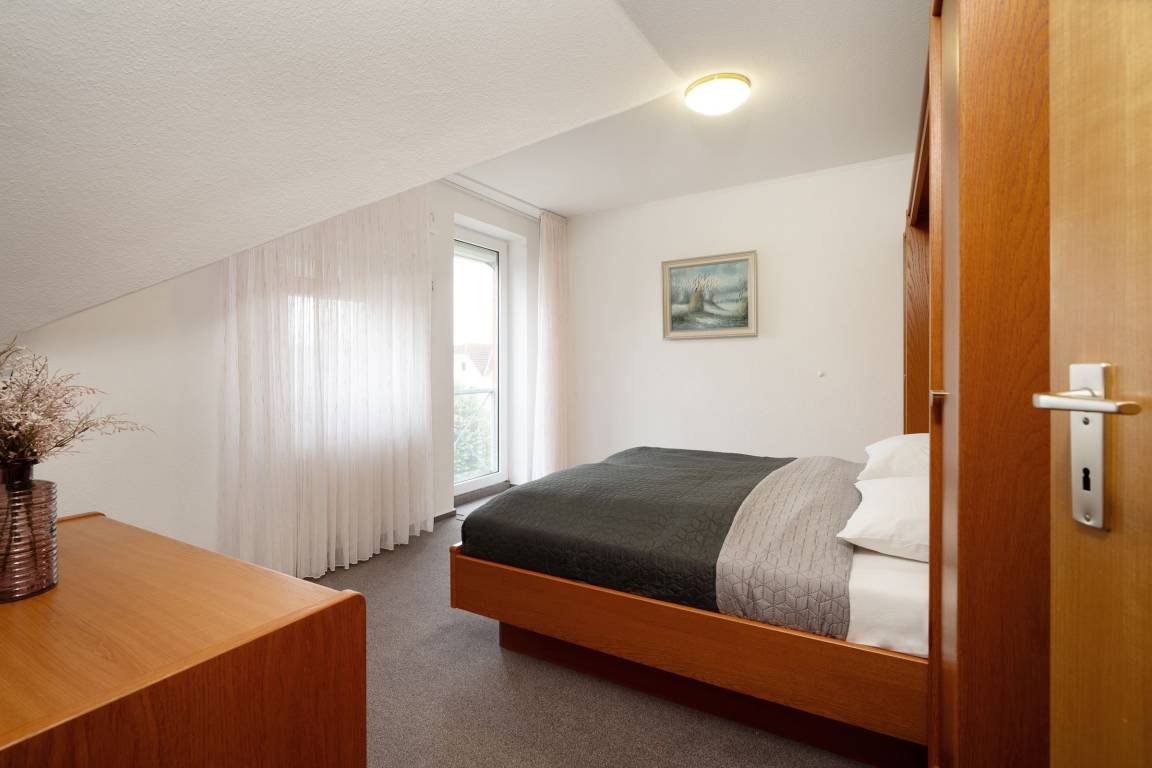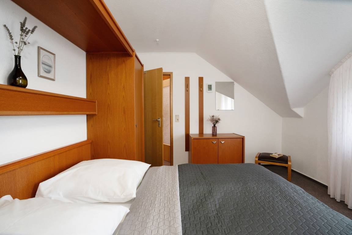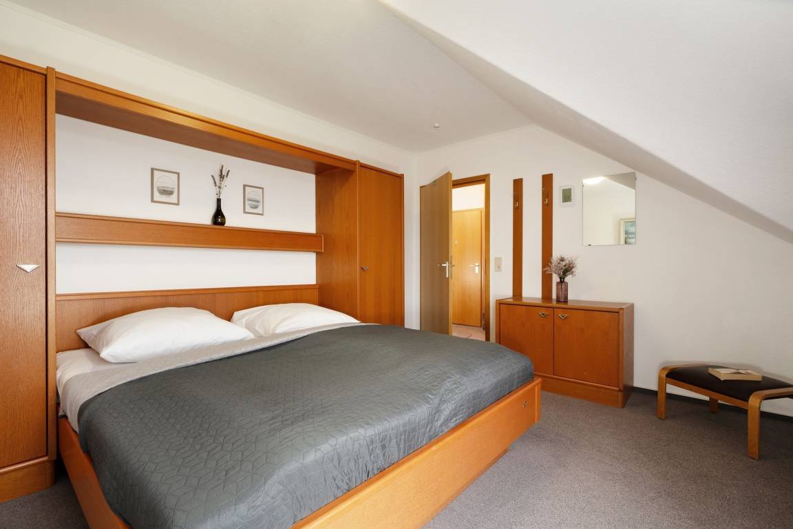 Schlafzimmer: 1 Doppelbett (2x 90x200 cm), Kleiderschrank, Verdunkelung (Rollo)