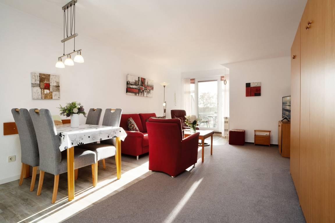 Lassen Sie sich verzaubern von der Lage – die Ferienwohnung Deichkieker im Ferien-Wohnpark Kaiserhof ist strandnah und befindet sich gleich hinter dem Deich. Hereinspaziert. Der Wohnbereich besticht durch seine farblich schön abgestimmte Einrichtung. Das rote Sofa und auch die beiden roten TV-Sessel versprechen pure Entspannung. Legen Sie die Füße hoch und freuen Sie sich über Ihre Auszeit. Wenn das Wetter mitspielt, können Sie diese auch wunderbar auf dem möblierten Balkon verbringen. Hier sitzen Sie gut geschützt und können die Aussicht und die gute Ostseeluft genießen. Der Strand ist übrigens nur rund 80 Meter entfernt. Zurück im Wohnzimmer: In einer schlichten Schrankwand verbergen sich 2 bequeme separat ausklappbare Betten (je 90x200 cm). Die moderne Küche ist in dem Wohnraum integriert und gut ausgestattet. Hier lassen sich sämtliche Lieblingsgerichte zubereiten, gleich nebenan steht eine schöne Essecke zum Schlemmen bereit. In einem separaten Schlafzimmer befindet sich ein bequemes Doppelbett (2x 90x200 cm). Hier werden Sie sicher angenehm von der schönen Ostseeküste träumen. Die Wohnung ist mit Teppichboden ausgelegt. Das lichtdurchflutete Badezimmer mit Dachfenster ist zweckmäßig ausgestattet.