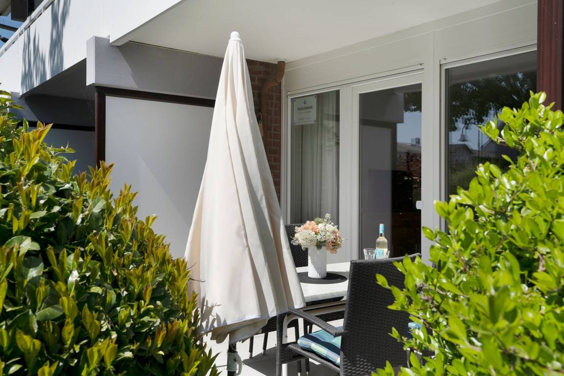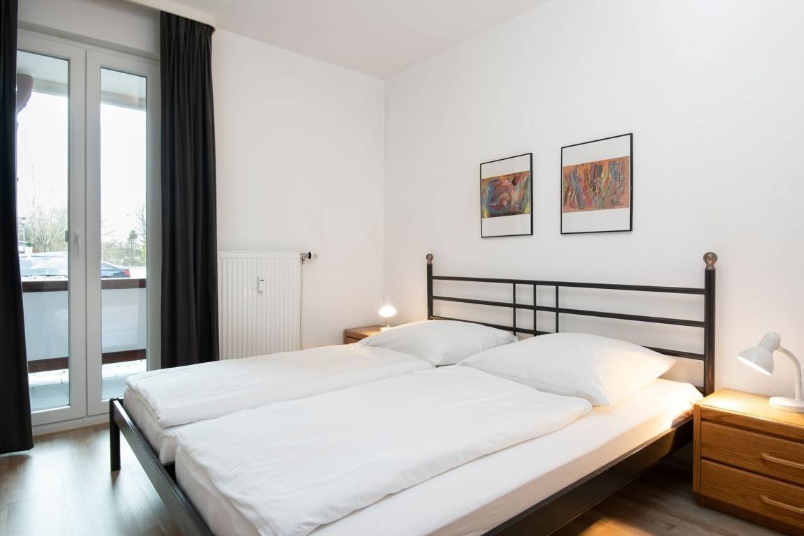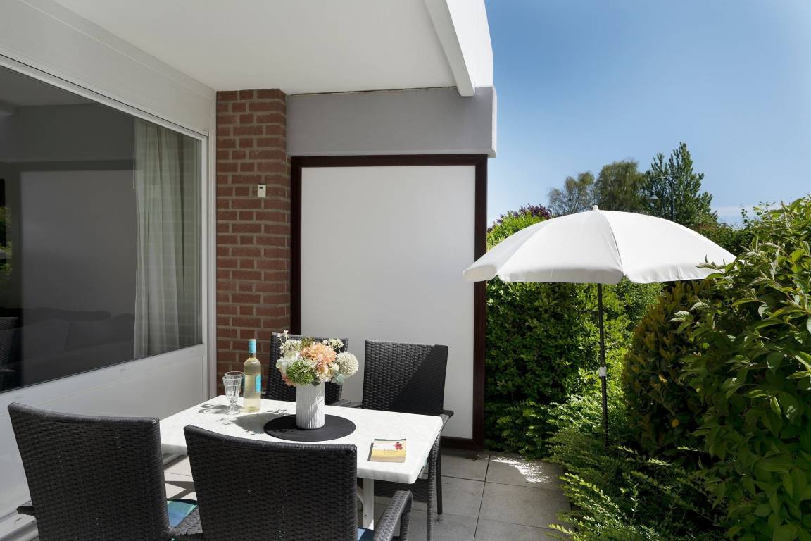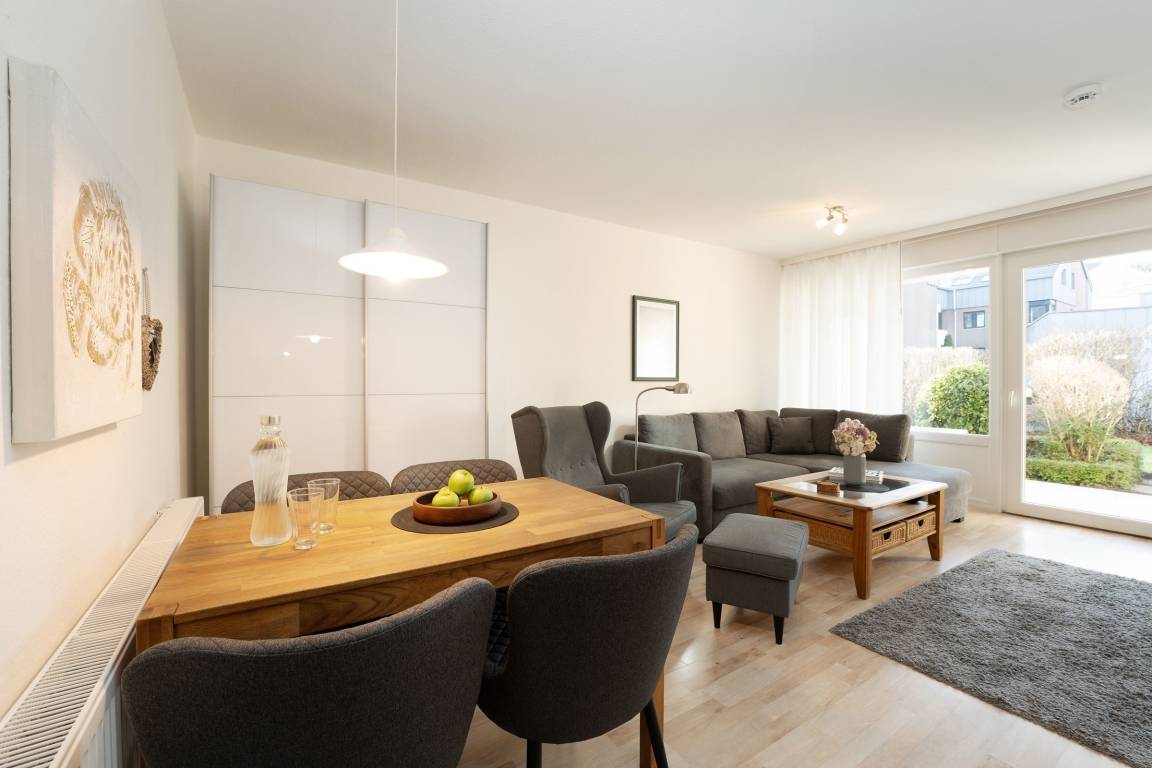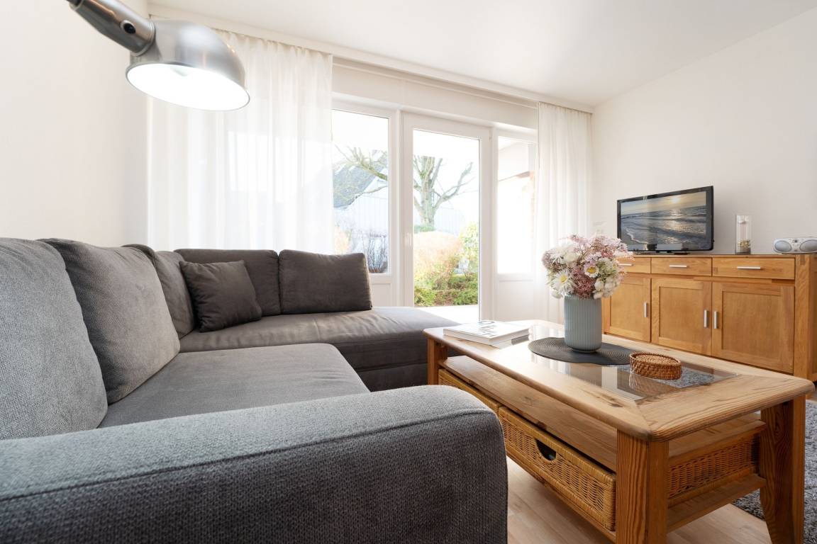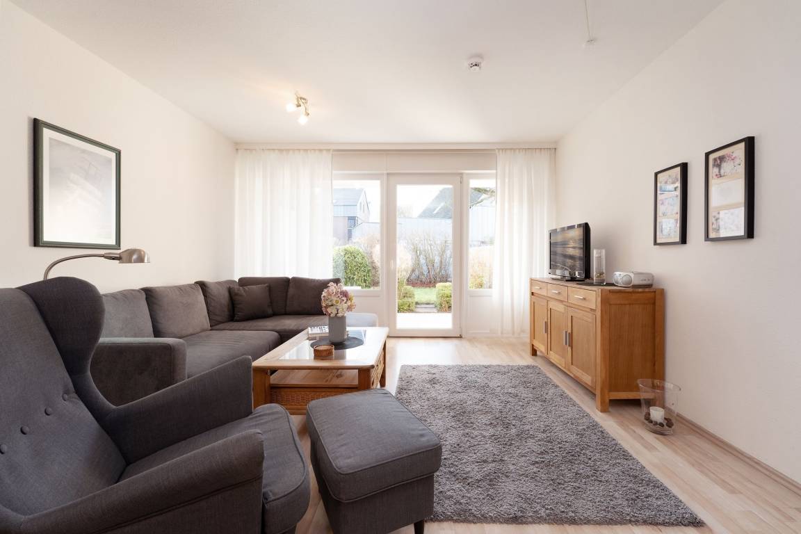 Über einen Flur gelangen Sie in den offen gestalteten Wohnraum mit integriertem Essbereich und angrenzender, voll ausgestatteter Küchenzeile. Verbringen Sie hier gesellige Spieleabende oder genießen Sie das gemeinsame Essen. Ein bequemes Sofa lädt Sie zu einem spannenden Buch oder erholsamen Stunden vor dem Fernseher ein. Zur Nacht lässt sich das Boxspring-Schlafsofa mühelos in einen weiteren sehr komfortablen Schlafplatz verwandeln (ca. 140x200 cm). Die beiden geräumigen Kleiderschränke im Wohnzimmer und Flur bieten ausreichend Platz für Ihre mitgebrachte Urlaubsgarderobe. Über einen kostenlosen WLAN-Anschluss können Sie Ihre Liebsten Zuhause mit aktuellen Urlaubsfotos versorgen. Vom Wohnbereich gelangen Sie auf die schöne, möblierte Terrasse, auf der Sie bei einem Glas Wein den Tag ausklingen lassen, oder bei einer Tasse heißen Kaffee aus der Tassimo Pad Maschine in den Tag starten können. Tanken Sie im separaten Schlafzimmer mit kleinem Balkon Energie für den nächsten Urlaubstag. In dem komfortablen Doppelbett (2x 90x200 cm) verbringen Sie geruhsame und schlafreiche Nächte. Das Badezimmer mit Dusche, Handtuchheizung und Fön vervollständigt dieses schöne Feriendomizil. Wohn- und Schlafzimmer lassen sich mit elektrischen Außenrollläden verdunkeln.