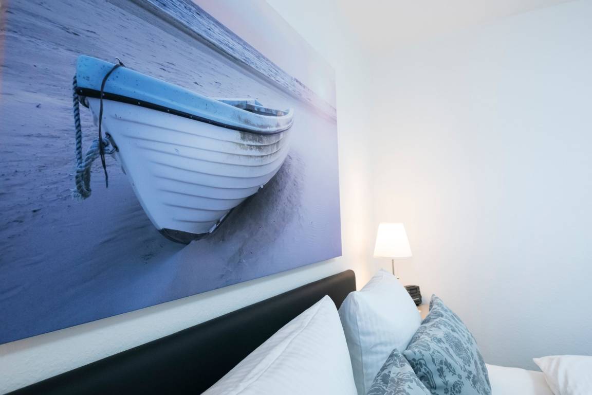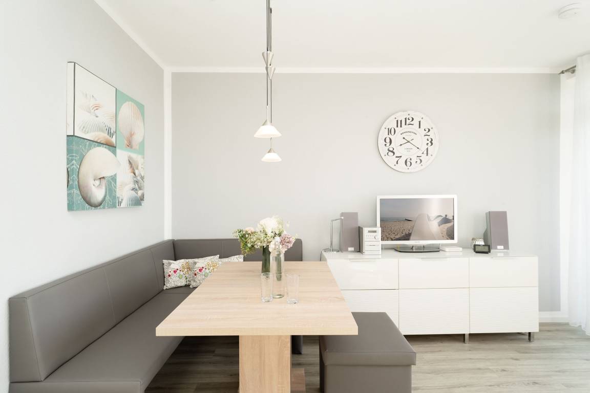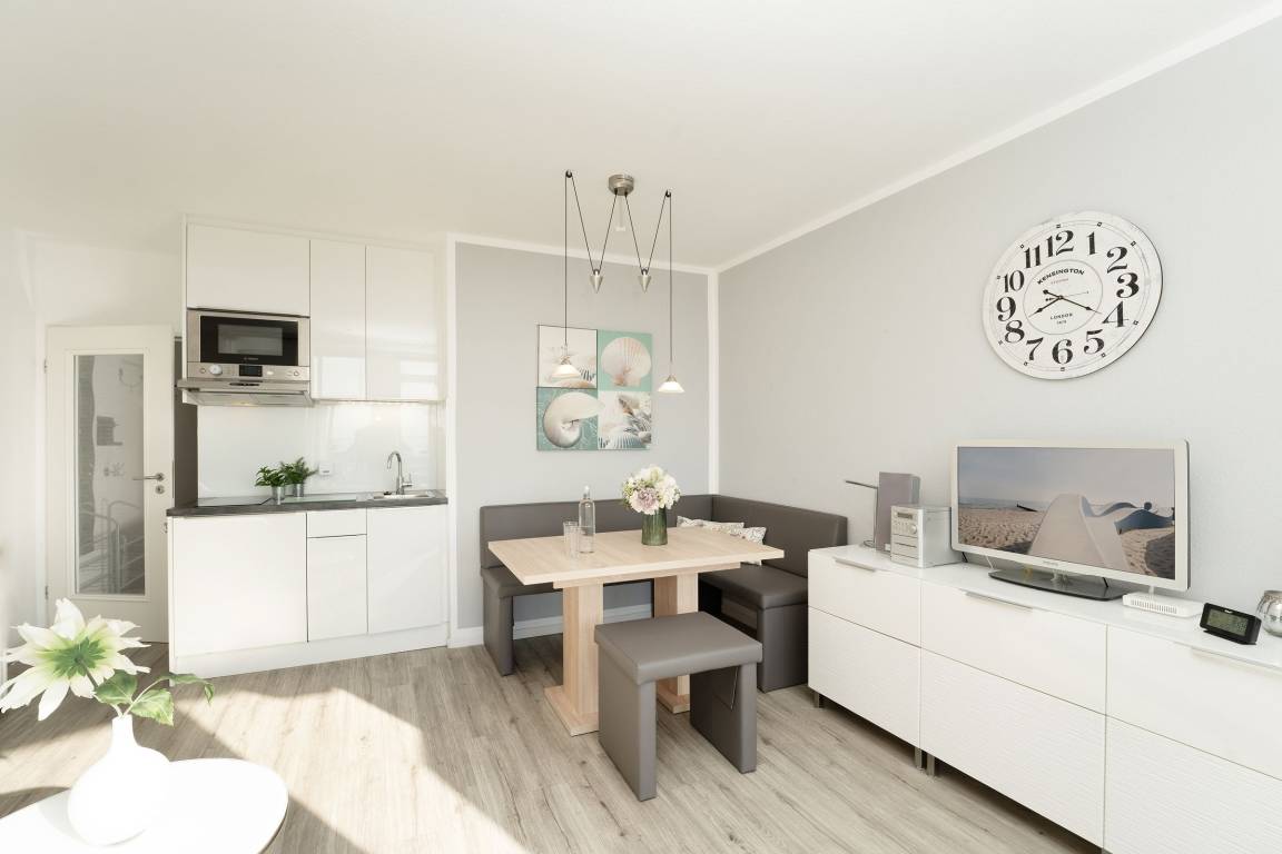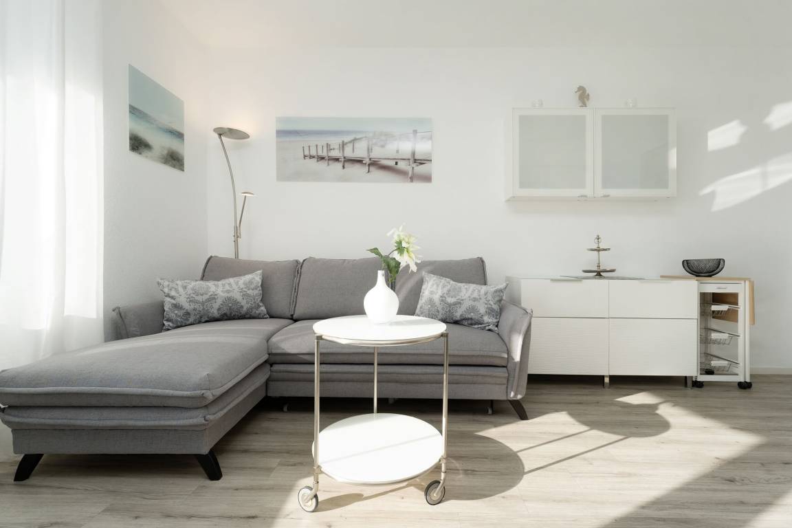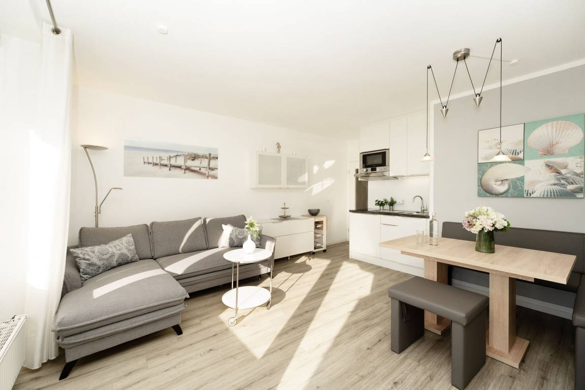 Herzlich willkommen! Dieses moderne Ferienobjekt verwöhnt Sie mit einem wunderbaren Meerblick und liegt nur rund 50 Meter vom Ostseestrand entfernt. Das edle Wohnzimmer verfügt über ein bequemes Ecksofa sowie eine gemütliche Essecke. Für Unterhaltung sorgen ein Kabel-TV und ein Radio. Die kleine, offene Küche ist u.a. mit einem 2-Platten-Herd, einer Mikrowelle, einem Kühlschrank und einer Kaffeemaschine ausgestattet. Nach einem schönen Urlaubstag am Strand können Sie sich auf eine erholsame Nacht im Boxspringbett (2x 80x200 cm) im separaten Schlafzimmer freuen. Das hellgeflieste Duschbad verspricht einen guten Start in den neuen Tag.