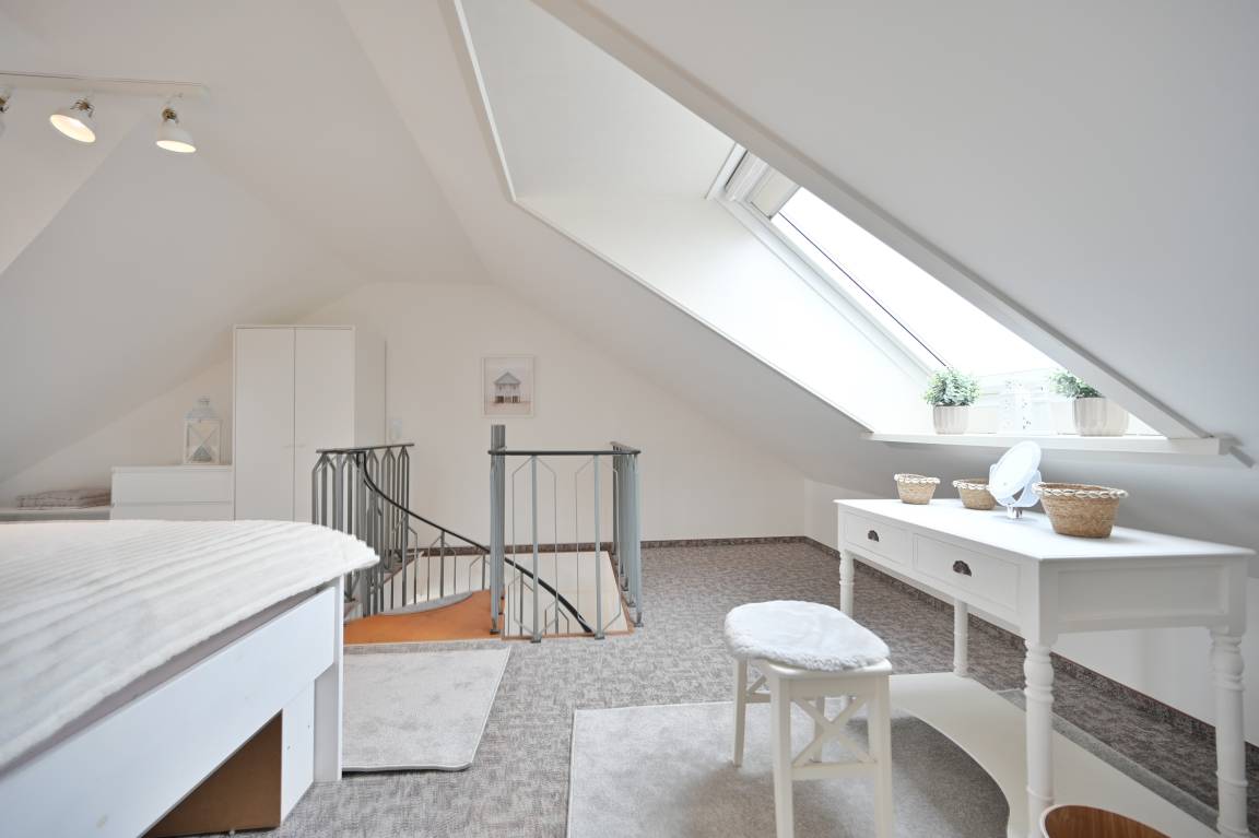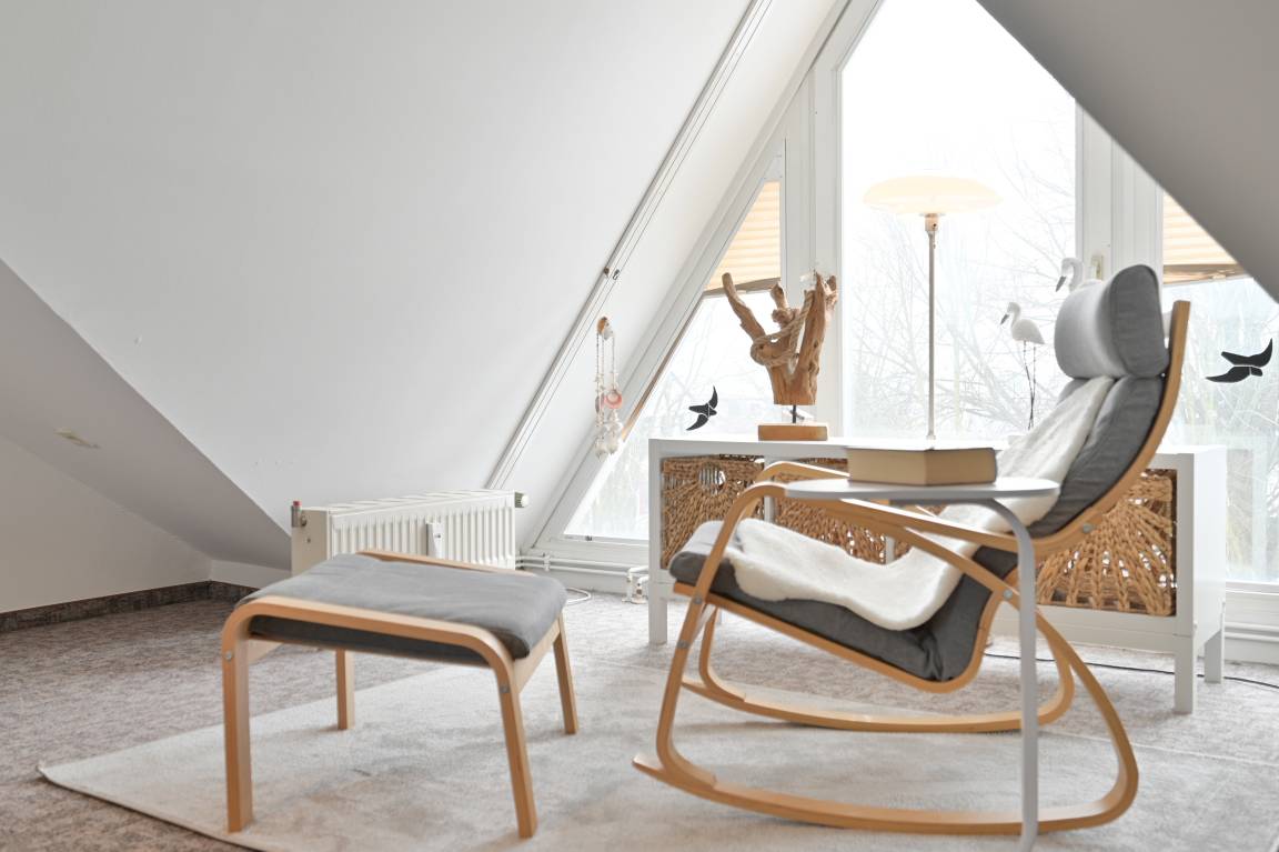 Einen weiteren Rückzugsort bietet das Studio-Schlafzimmer im Dachgeschoss, ob Sie sich im Schaukelstuhl mit Fußhocker vor dem bodentiefen Dreiecksfenster ausruhen möchten oder ein gutes Buch lesen - hier fängt Ihre Auszeit an. Das große Bett (2 x 90x200 cm) mit ergonomischen 7-Zonen Lattenrosten bietet Ihnen zudem einen erholsamen und gesunden Schlaf.
