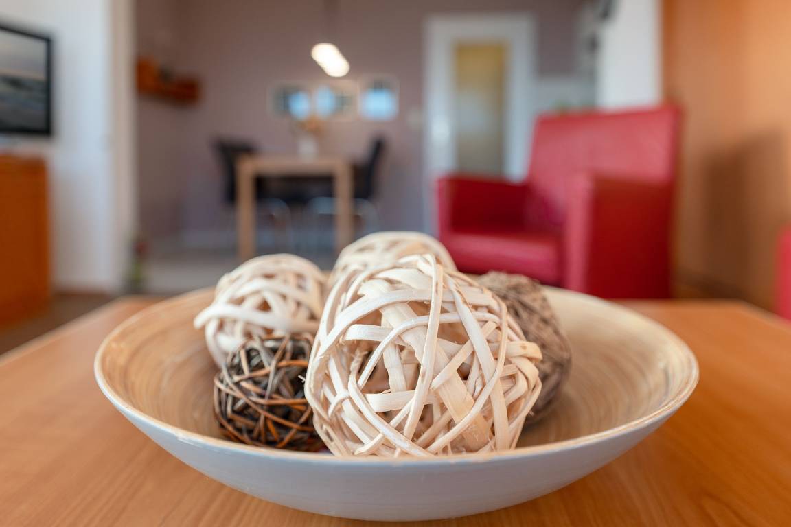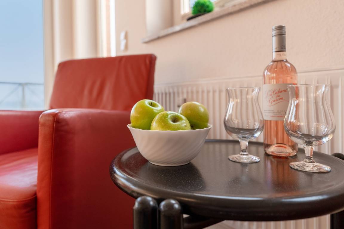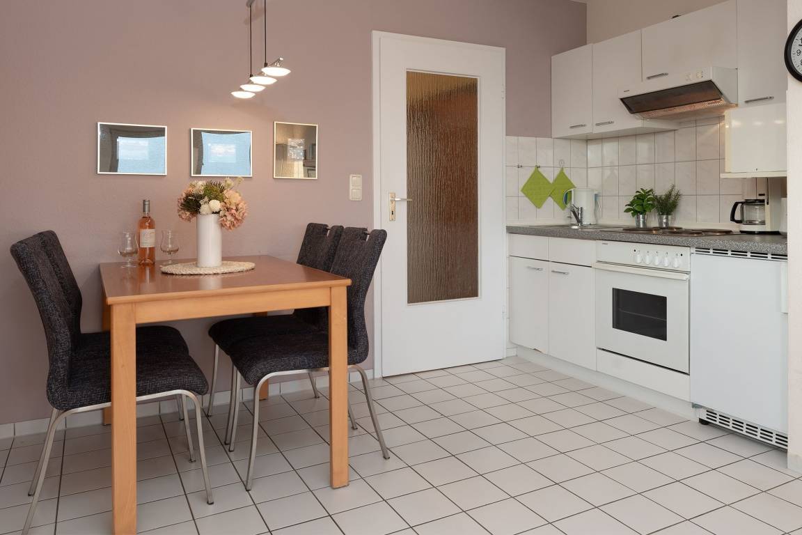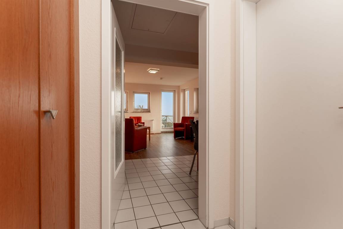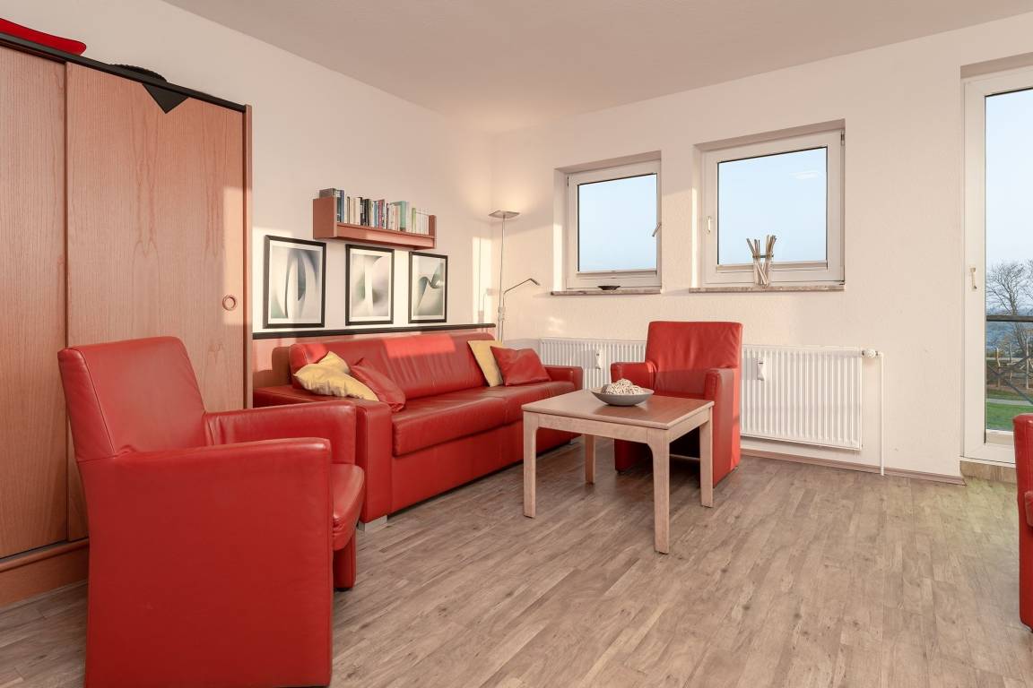 Stellen Sie sich vor, Sie wachen morgens auf, treten auf den Balkon – und sehen die Ostsee. Wer seinen Urlaubstag so beginnen möchte, ist in der Ferienwohnung Mehrblick im gepflegten Ferien-Wohnpark Kaiserhof genau richtig. Im hinteren Teil des Wohnzimmers begrüßt Sie ein gemütliches Sofa sowie 3 Sessel im schicken Rot. Entspannen Sie hier abends gemütlich vor dem TV-Gerät. Von hier aus haben Sie Zutritt auf den möblierten Balkon in südlicher Lage – sicher das Highlight der Wohnung. Ist der Blick nicht zauberhaft? Genießen Sie hier Ihre Auszeit. Vielleicht bei einem Glas Wein? Die offene Küchenzeile mit Sitz-Ecke ist räumlich und farblich getrennt vom Wohnbereich. Hier können Sie wunderbar in Ruhe neue Rezepte aus der Region ausprobieren. Für die Nacht stehen Ihnen mehrere Schlafmöglichkeiten zur Verfügung: Das Sofa im Wohnbereich lässt sich in ein bequemes Doppelbett (145x200 cm) verwandeln. Und im separaten Schlafzimmer befinden sich 2 Einzelbetten (je 90x200 cm). Träumen Sie hier von der schönen Ostsee. Das innenliegend Duschbad ist hell gefliest und verspricht einen guten Start in den Tag.