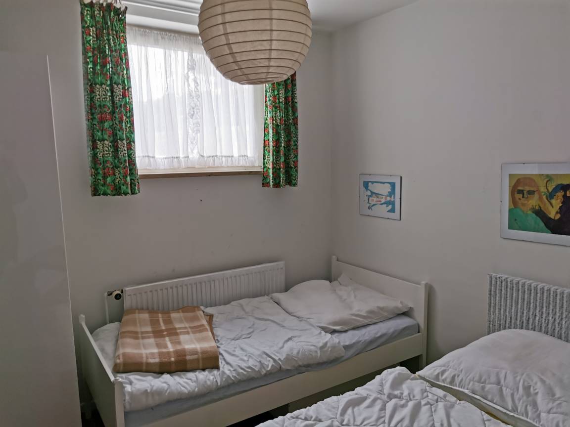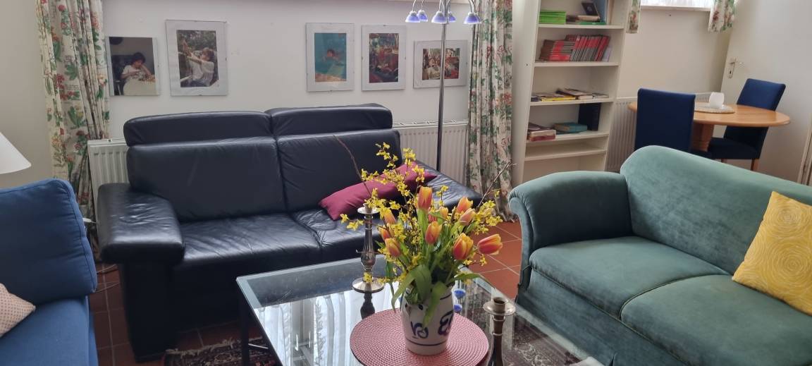 (gut belichtet, Fenster über der Erdoberfläche). Im ca. 30 m² großen Wohnzimmer steht ein Doppelschlafsofa. Es gibt ein Duschbad. In den Schlafzimmer sind zwei Doppelbetten und jeweils ein Einzelbett vorhanden, 1 Kinderbett ist möglich. Die Küche ist mit E-Herd mit Ceranfeld und Backofen, Geschirrspüler, Mikrowelle und Tiefkühlschrank ausgestattet. Kinderbett und Hochstuhl können Sie ohne Aufpreis erhalten. Waschmaschine und Trockner werden über einen Münzautomaten abgerechnet. Über WLAN haben Sie kostenlosen Internetzugang. Unseren Garten können Sie zum Spielen, Grillen und Entspannen nutzen, Sandkasten und Schaukelgerät, Liegestühle und sonstige Gartenmöbel stehen Ihnen zur Verfügung. Ein Haustier (Hund) ist in der Nebensaison erlaubt.