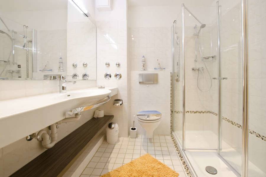 Ein schönes neues Badezimmer mit Dusche und WC und ein Flur mit Einbauschrank gehören ebenso zur Ferienwohnung, wie ein eigener Einstellplatz mit der Nr. 18/5 und elektrische Fensterläden.