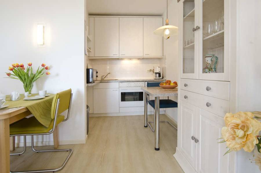 Die Wohnung verfügt außerdem über eine integrierte Küche mit Essecke sowie über ein separates Schlafzimmer mit Doppelbett und Eckkleiderschrank mit Ganzkörperspiegel.