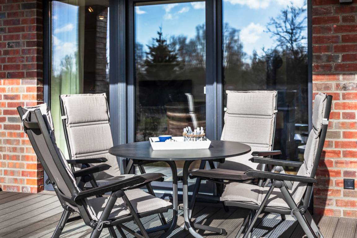 Eine großzügige Wohnlandschaft mit offenem Wohn- und Essbereich lädt Sie zu einem gemütlichen Beisammensein nach einem wohltuenden Saunaaufenthalt ein. Lassen Sie den Abend in aller Ruhe auf der schönen nach Süden ausgerichteten Terrasse ausklingen, nachdem Sie in der hochwertigen Küche köstliche Speisen zubereitet haben, oder genießen Sie die wohlige Wärme des Kamins bei einem Glas Rotwein.