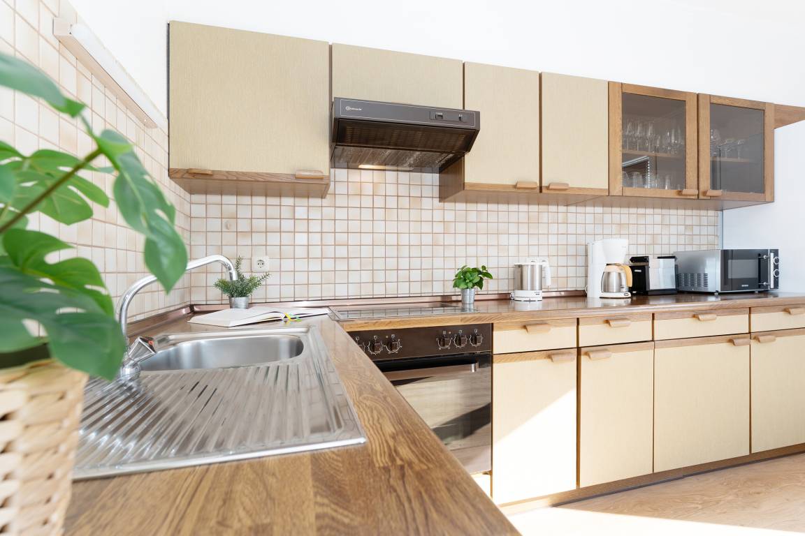 Der Rundgang beginnt im gemütlichen Wohnbereich, der mit einem Fernseher, DVD-Player, Radio und Hifi-Anlage zu entspannten Stunden einlädt. Von hier gelangen Sie auf die schönen Süd-Balkon, der mit Gartenmöbeln ausgestattet ist und dank ausfahrbarer Markise zum Verweilen im Freien einlädt – Grillen ist allerdings nicht gestattet. Weiter geht es in die moderne Küchenzeile mit Geschirrspülmaschine, Kühlschrank, Mikrowelle, Toaster sowie Kaffeemaschine. Der angrenzende Essbereich bietet Platz für gemeinsame Mahlzeiten.