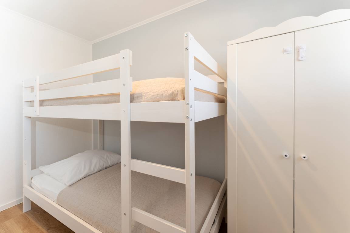 Das erste Schlafzimmer verfügt über ein komfortables Doppelbett, während im zweiten Schlafzimmer ein Etagenbett bereitsteht – ideal für Familien. Verdunklungsmöglichkeiten sorgen für angenehmen Schlafkomfort. Das großzügige Bad bietet eine Dusche mit einer Einstiegshöhe von 10cm, sowie einen beheizbaren Handtuchhalter.