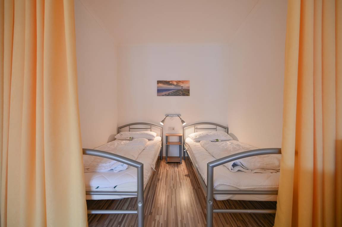 Die Ferienwohnung verfügt über einen kombinierten Wohn- Schlafraum mit 2 feststehenden Einzelbetten, die durch einen Vorhang vom Wohnbereich abgetrennt werden können.