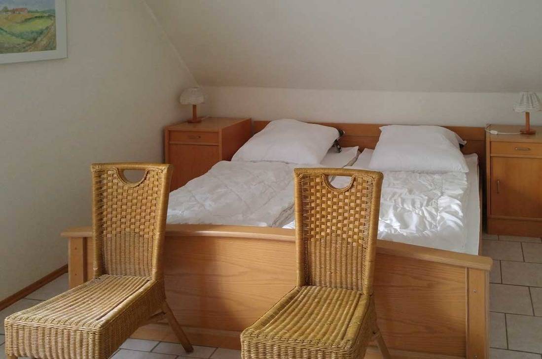 Die schöne Fewo verfügt über ein Schlafzimmer mit Doppelbett, Kleiderschrank und zwei Stühle.