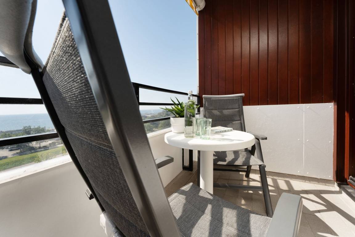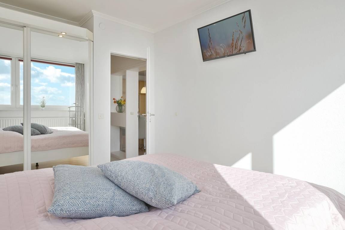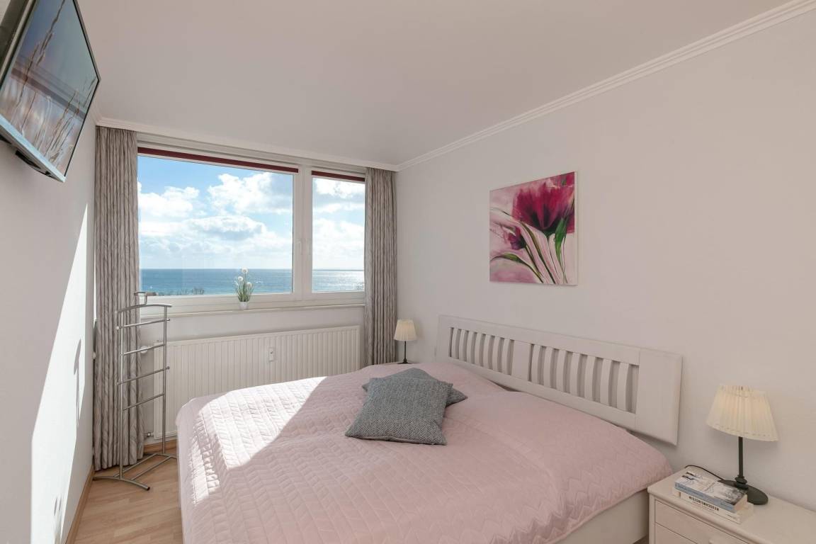 Der lichtdurchflutete Wohn-/Schlafbereich begeistert mit bequemer Couchecke, internetfähigem Smart-TV, Essplatz für 4 Personen sowie direktem Balkonzugang und herrlichem Meerblick. Zwei hochwertige Schrankbetten (je 90 x 200 cm) liegen im hinteren Teil des offenen Wohnbereichs, gemütlich in einer Nische. Tagsüber ist somit reichlich Platz im Wohnzimmer und am Abend genießt man den traumhaften Ausblick vom Bett aus auf die funkelnde Ostsee. Die kleine, aber feine Küche ist separat, mit einer gläsernen Trennwand aber optisch mit dem Wohnraum verbunden – hier kocht man also nicht allein. Tolle Alltagshelfer wie Ceranherd, Backofen, Mikrowelle und Spülmaschine dürfen natürlich nicht fehlen. Im Spiegelschrank findet Ihre Urlaubsgarderobe Platz und die Ostsee leuchtet durch das Fenster. Im separaten Schlafzimmer mit Doppelbett (2x 90x200 cm) können Sie sich nach einem schönen Urlaubstag erholen. Das moderne Bad ist hell und geschmackvoll mit Eckdusche, beleuchtetem Spiegel, Waschbecken und WC ausgestattet.