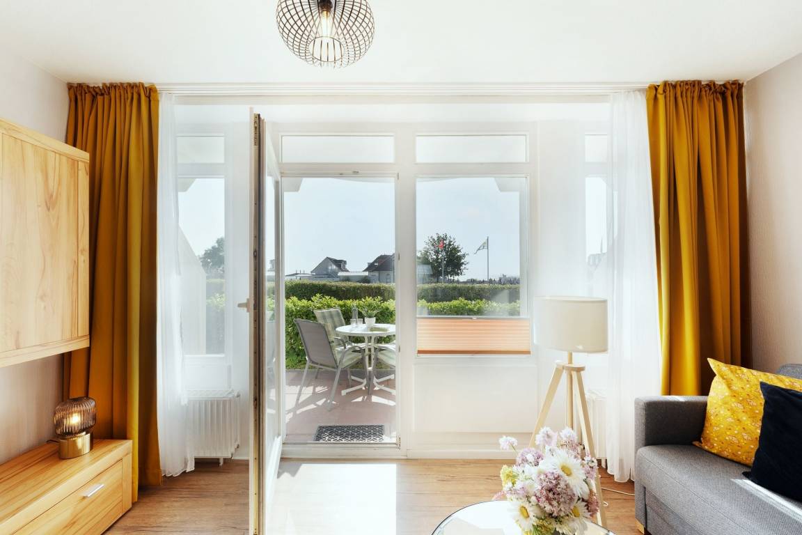 Urlaub in der 1. Reihe von Kellenhusen: 2-Zimmer-Ferienwohnung im Haus Seeblick mit ca. 39 m² Wohnfläche und Terrasse mit Meerblick für bis zu 4 Personen.