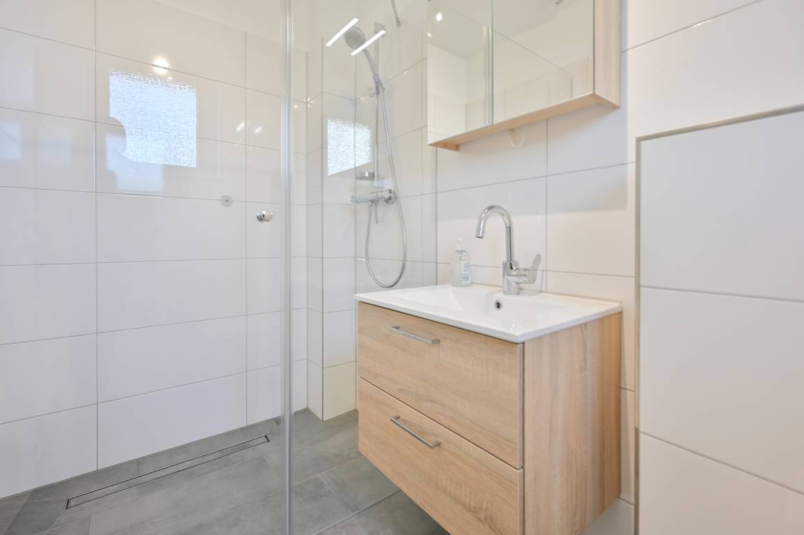 Das Badezimmer im Erdgeschoss verfügt über eine bodengleiche Dusche, Waschtisch, WC und Außenfenster.