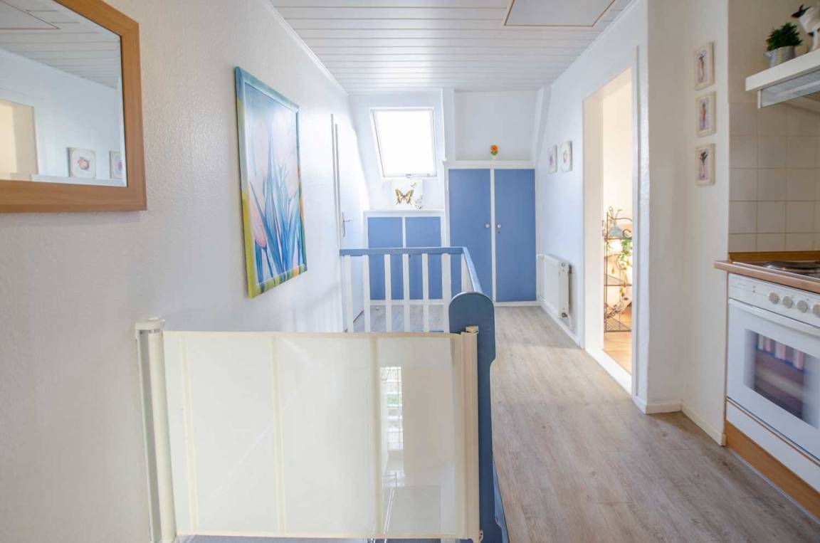 Im Flurbereich ist die Küche integriert, die Treppe ins Untergeschoss ist mit einem spannbaren Schutz versehen. Die Eingangstür zum Appartement befindet sich im Erdgeschoss.
