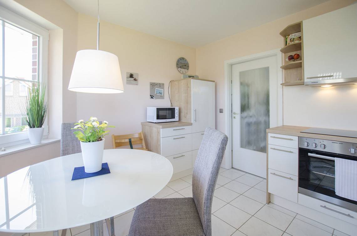 Die helle Küche, mit kleinem Ess- & Arbeitsplatz im sonnigen Erker, bietet Ihnen angenehme Urlaubstage zu jeder Jahreszeit.