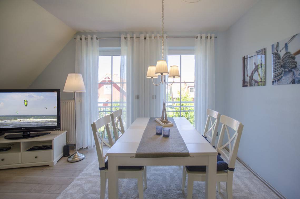 Ein schöner großzügiger Wohnbereich ist mit gemütlicher Sitzgarnitur, Esstisch mit 4 Stühlen, Sat-TV und Blueray-Player eingerichtet.