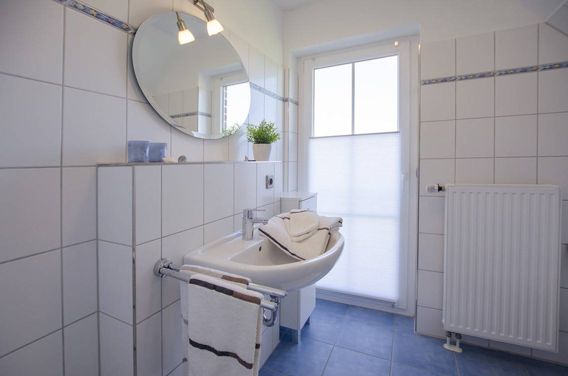 Das große Badezimmer verfügt über eine Badewanne, eine ebenerdige Dusche, WC und Waschtisch.