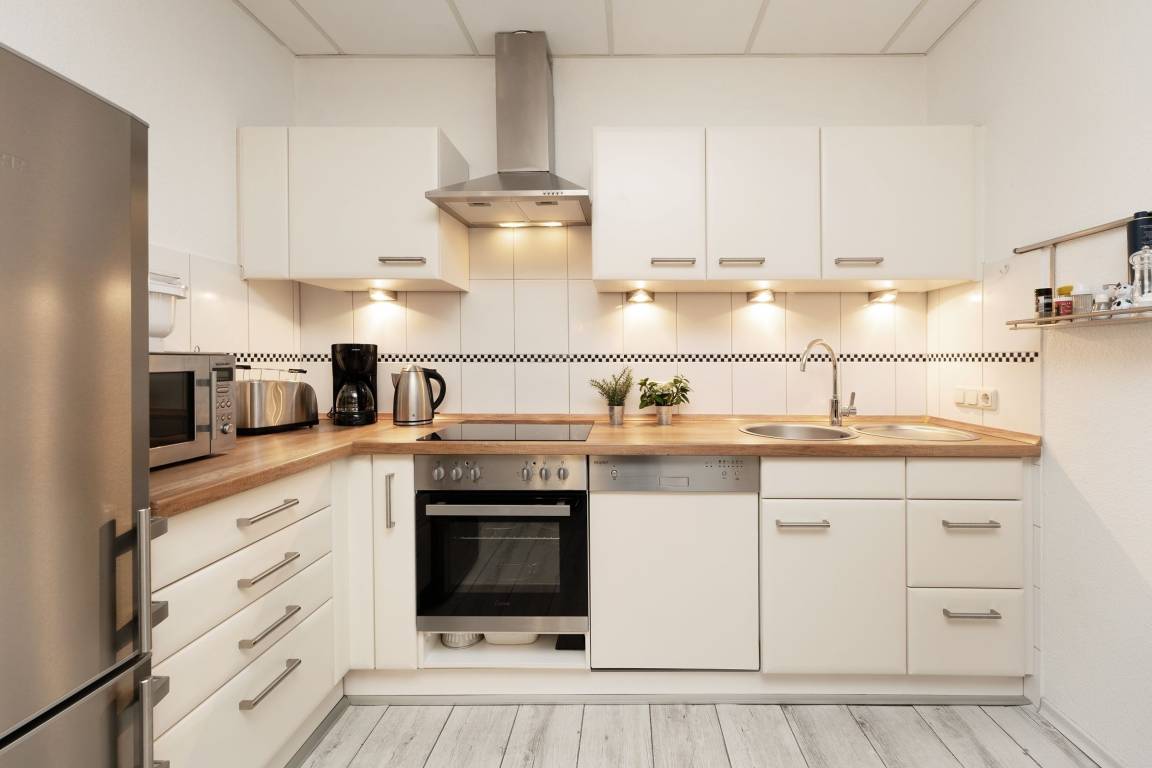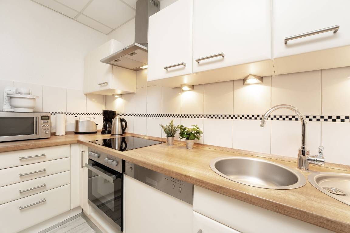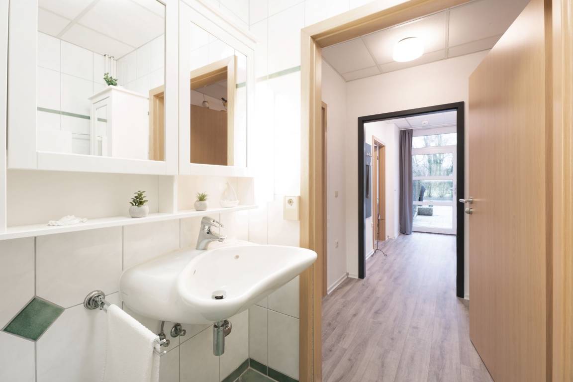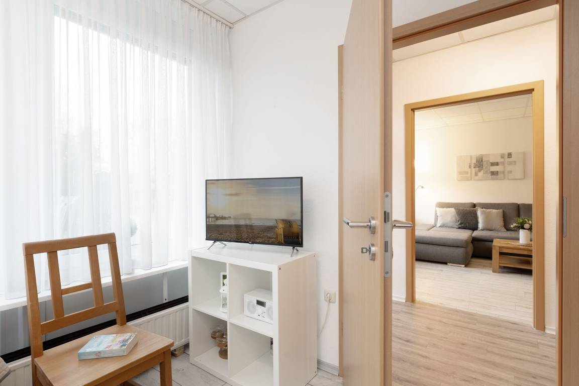 Herzlich willkommen am Meer! Die Erdgeschoss-Wohnung Meeresrauschen in den Strandappartements am Leuchtturmweg ist mit direktem Zugang vom Parkplatz aus erreichbar und nur rund 100 Meter vom Ostseestrand entfernt. Der modern eingerichtete Wohnbereich empfängt Sie mit einer bequemen Sitzecke. Hier – oder auch auf der möblierten Terrasse – können Sie prima entspannen. Die offene, sehr gut ausgestattete Küche lädt zum gemeinsamen Kochen ein, genießen Sie Ihre Speisen anschließend am schicken Essplatz. Für Unterhaltung ist gesorgt: In der Wohnung befinden sich 3 TV-Geräte. Für die Nacht lässt sich das Schlafsofa im Wohnzimmer in eine Ausweichschlafgelegenheit verwandeln (ca. 140x200 cm). Zudem stehen Ihnen zwei Schlafräume mit einem Doppelbett (2x 100x200 cm) bzw. zwei Einzelbetten (je 100x200 cm) zur Verfügung. Das Duschbad ist rollstuhlfreundlich eingerichtet.
