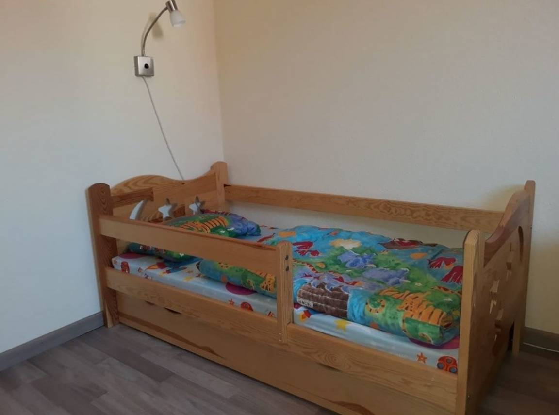 Die helle und freundliche Wohnung (60 qm) befindet sich im 1. Stock von unserem "To Hus". Sie verfügt über einen schönen Süd-Balkon zum Garten, ein Wohnzimmer (Esstisch, Couchgarnitur und TV), ein Elternschlafzimmer (mit Doppelbett), ein Kinderzimmer (zwei Einzelbetten und ein Kinderbett (0,70 x 1,40 m), eine separate Küche (mit Spülmaschine) und ein neues Bad mit Dusche/WC.