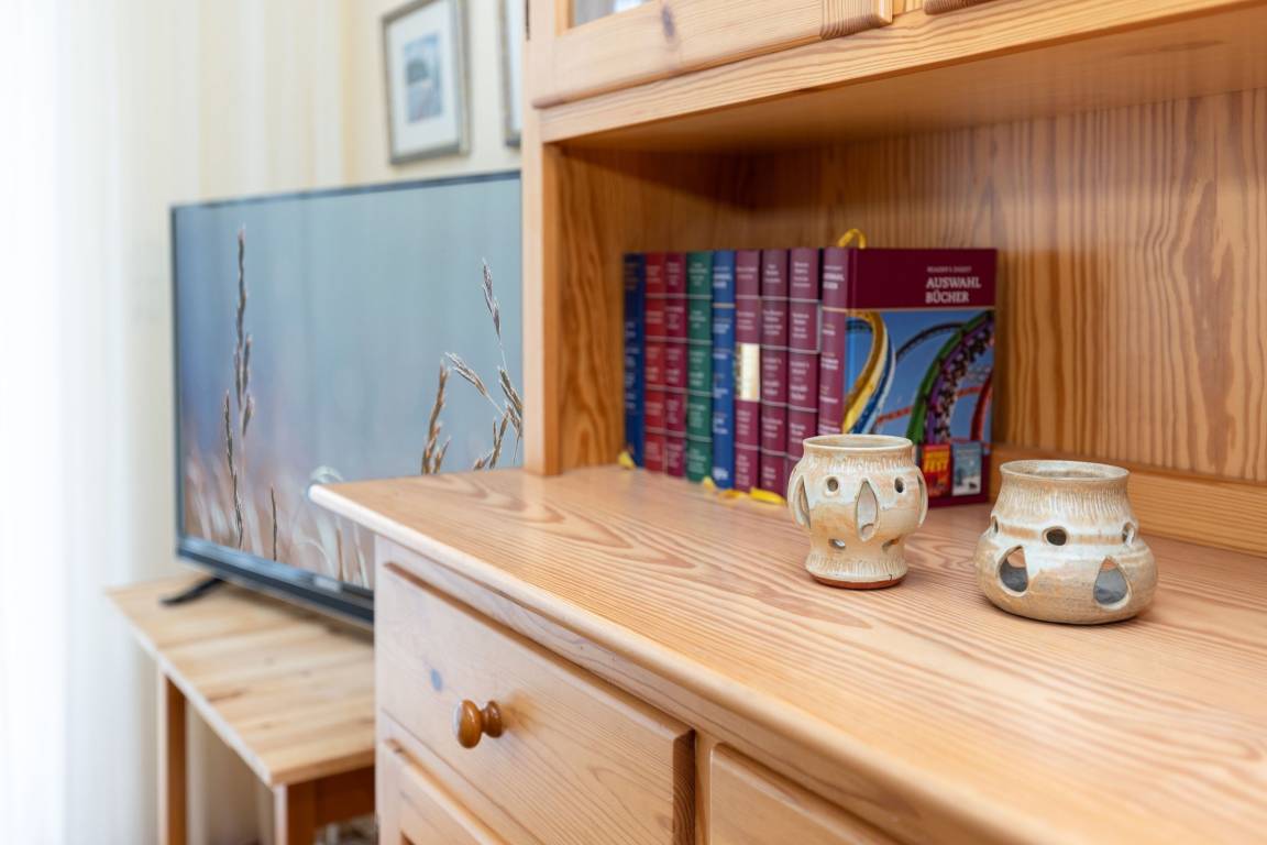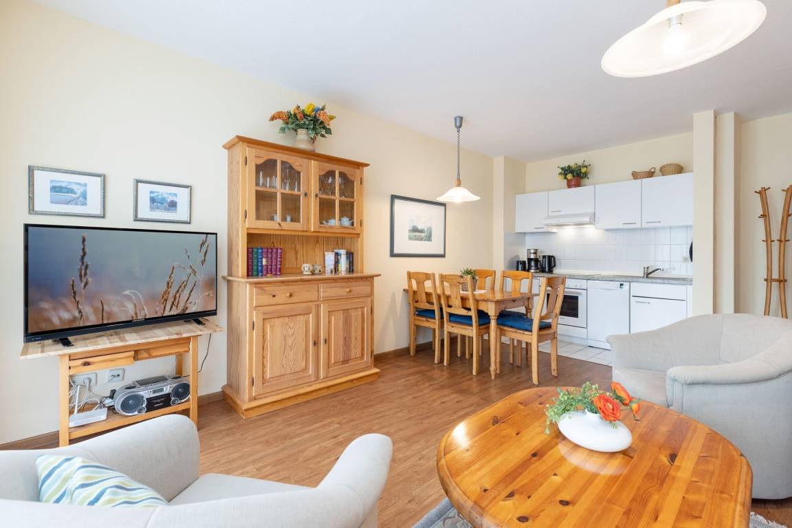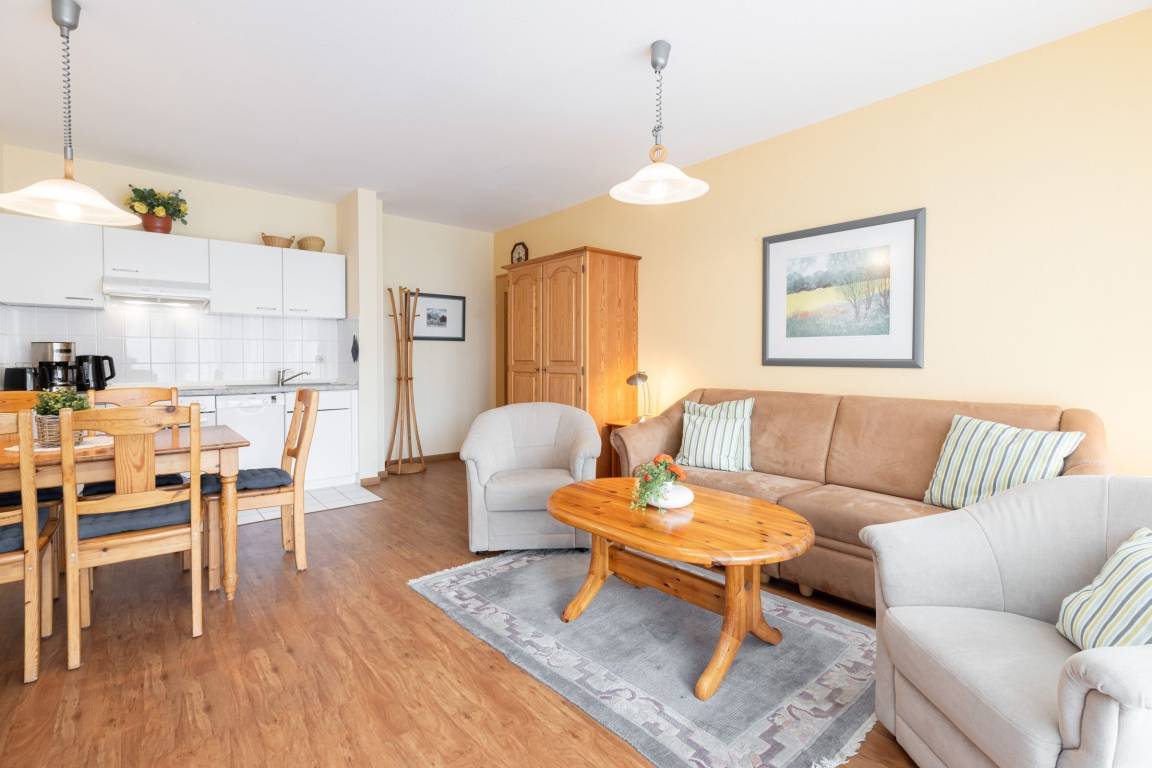 Ankommen und Wohlfühlen. Über ein paar Stufen erreichen Sie die gepflegte Ferienunterkunft im Wohnpark Kaiserhof – nur rund 65 Meter vom Ostseestrand entfernt. Ein kuscheliges Sofa sowie zwei bequeme Sessel laden Sie im Wohn/Essbereich zum Entspannen vor dem großen TV-Gerät ein. Gleich daneben haben Sie Zutritt auf die möblierte Terrasse. Diese ist zur Ostsee hin ausgerichtet und bietet einen schönen Blick ins Grüne. Sicher hören Sie von hier aus das Meer rauschen und können Ihre freie Zeit draußen wunderbar und bestens geschützt genießen. Die gut ausgestattete Küche mit Spülmaschine ist in den Wohnraum integriert. Ihre selbst zubereiteten Speisen können Sie in der kleinen Essecke zu sich nehmen. Nach einem tollen Tag an der Küste haben Sie für die Nacht die Auswahl: Zum einen lässt sich das Sofa im Wohnbereich in ein Doppelbett (ca. 150x200 cm) verwandeln. Zum anderen befinden sich im schicken separaten Schlafzimmer 2 Einzelbetten (je 90x200cm), die zu einem Doppelbett zusammengeschoben sind. Wir wünschen zauberhafte Träume. Das großzügige Bad mit Tageslicht verspricht einen angenehmen Start in den nächsten Urlaubstag.