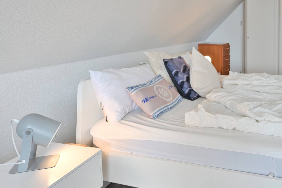 Im Schlafzimmer auf der ersten Etage befindet sich ein gemütliches Doppelbett.