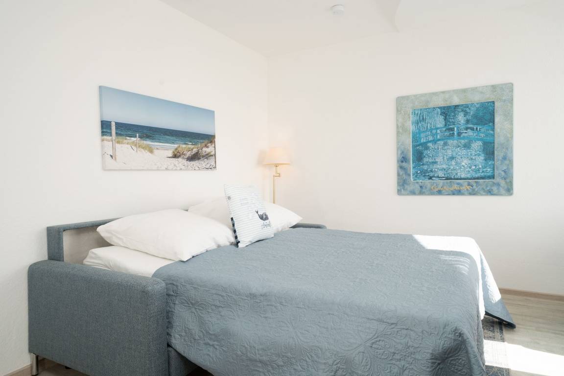 Mehr Ostsee geht kaum. Die Ferienwohnung Muschelkrebs im gepflegten Ferien-Wohnpark Kaiserhof bietet Ihnen einen traumhaften Ostsee-Blick und ist dazu nur rund 120 Meter vom Strand entfernt. Treten Sie ein, Ihr Urlaub kann beginnen. Der helle Wohnbereich begrüßt Sie mit einer schönen Polster-Garnitur. Hier können Sie gut relaxen, die Dachschrägen sorgen dabei für eine gemütliche Atmosphäre. Bei der Couch handelt es sich um eine Schlafcouch, die sich bei Bedarf in ein Doppelbett (ca. 160x200 cm) verwandeln lässt. Von hier aus haben Sie Zugang auf den möblierten Balkon. Ist der Blick über die Ostsee nicht grandios? Genießen Sie die Aussicht zum Beispiel bei einem Glas Wein. Zurück im Wohnbereich: Die offene Küchenzeile befindet sich um die Ecke. Bereiten Sie hier Ihre Lieblings-Speisen zu und genießen Sie diese in der gemütlichen Ess-Ecke – auch hier haben Sie einen tollen, seitlichen Blick auf die Ostsee. Ihre wohlverdiente Nachtruhe finden Sie im separaten Schlafzimmer. Das Doppelbett (2x 80x200 cm) ist sehr bequem und hat ein offenes Fußende. Das helle Duschbad ist mit einem beleuchteten Spiegel ausgestattet.