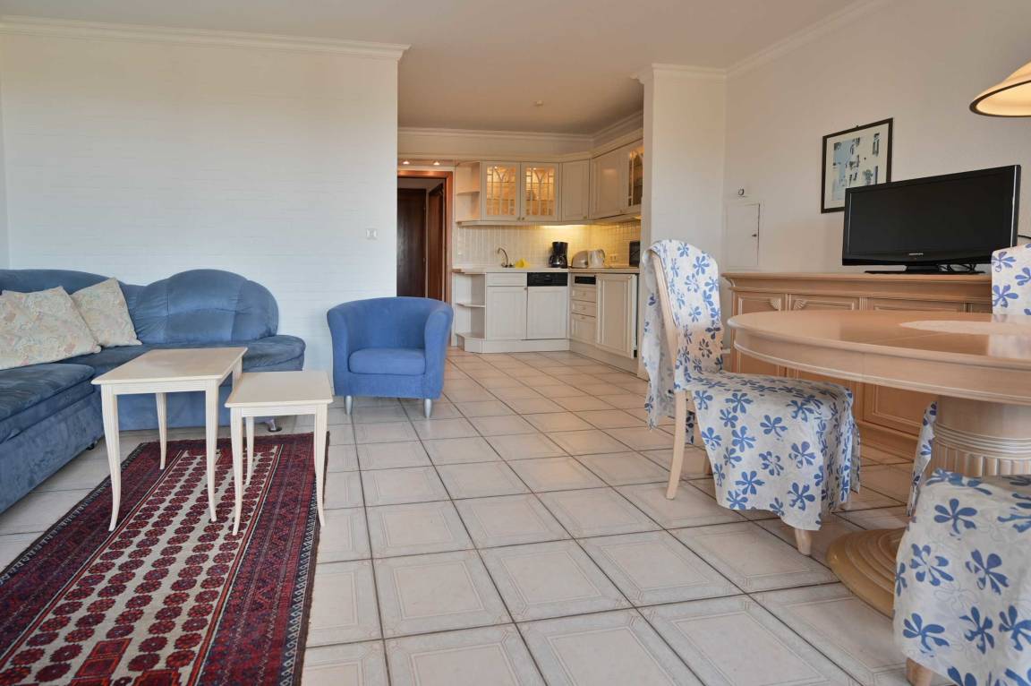 Die Ferienwohnung im Ostseebad Kellenhusen verfügt über einen Wohn-Schlaf-Raum mit großem Doppel-Schlafsofa (Eckcouch) und 1 Sessel, rundem Esstisch mit 4 Stühlen, Balkon mit Stühlen, Tisch, integrierter Küchenzeile, über einen Flur mit Garderobe, ein Badezimmer mit Dusche/ WC (mit Duschkabine), Spiegelschrank sowie über ein Schlafzimmer mit 2 Einzelbetten mit Mittelgang.