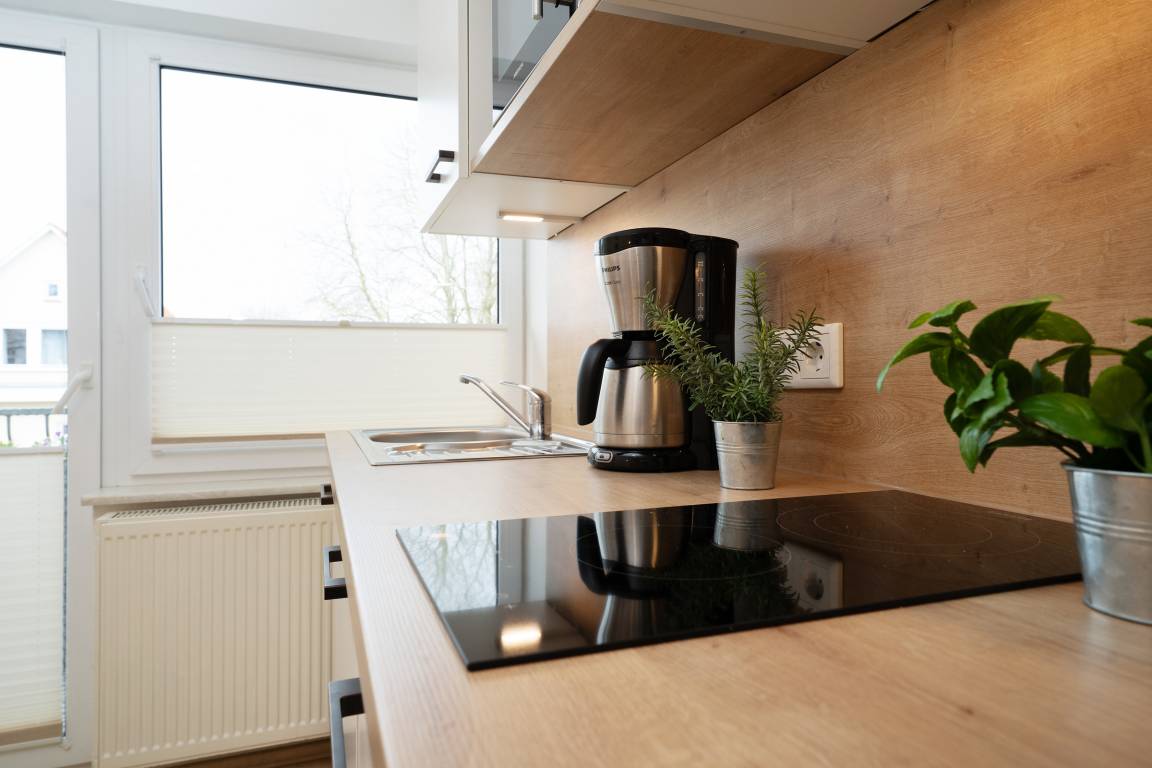 Die Ferienwohnung begrüßt Sie mit einem hellen und freundlich eingerichteten Wohnbereich, der mit gemütlicher Sitzecke und TV zum Entspannen einlädt. Von hier aus gelangen Sie auf den Balkon, auf dem Sie die frische Ostseeluft genießen können. Die integrierte Küche ist gut ausgestattet und bietet mit Ceranfeld, Backofen, Kühlschrank, Kaffeemaschine, Wasserkocher und weiteren Küchenutensilien alles, was Sie für Ihre Selbstverpflegung benötigen; der Essbereich fügt sich harmonisch in den Wohnraum ein. Das separate Schlafzimmer ist mit einem komfortablen Doppelbett und Kleiderschrank ausgestattet und sorgt für erholsame Nächte. Das Badezimmer verfügt über Dusche und WC und rundet den Wohnkomfort ab.