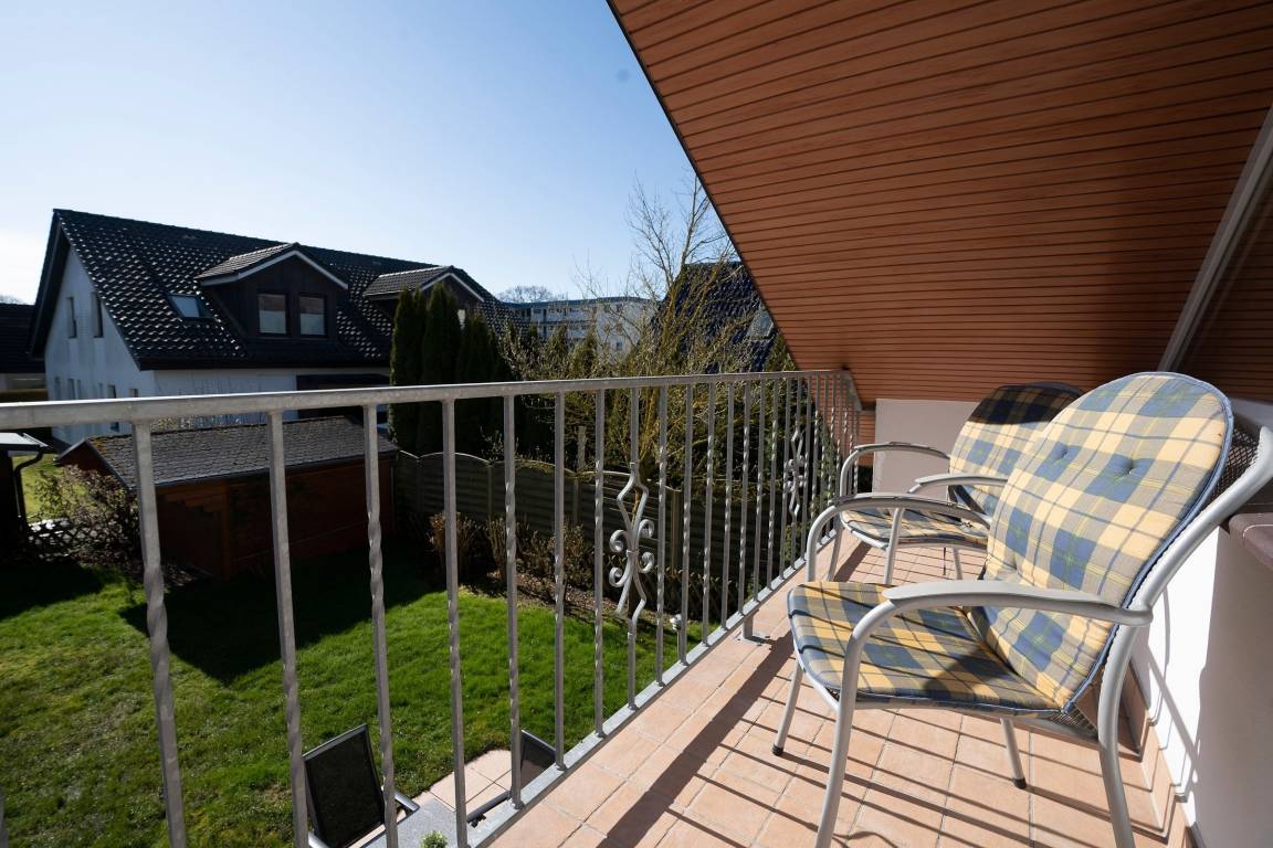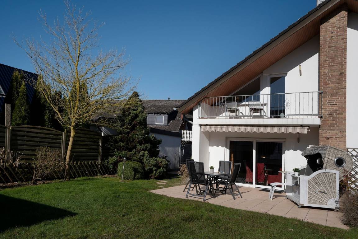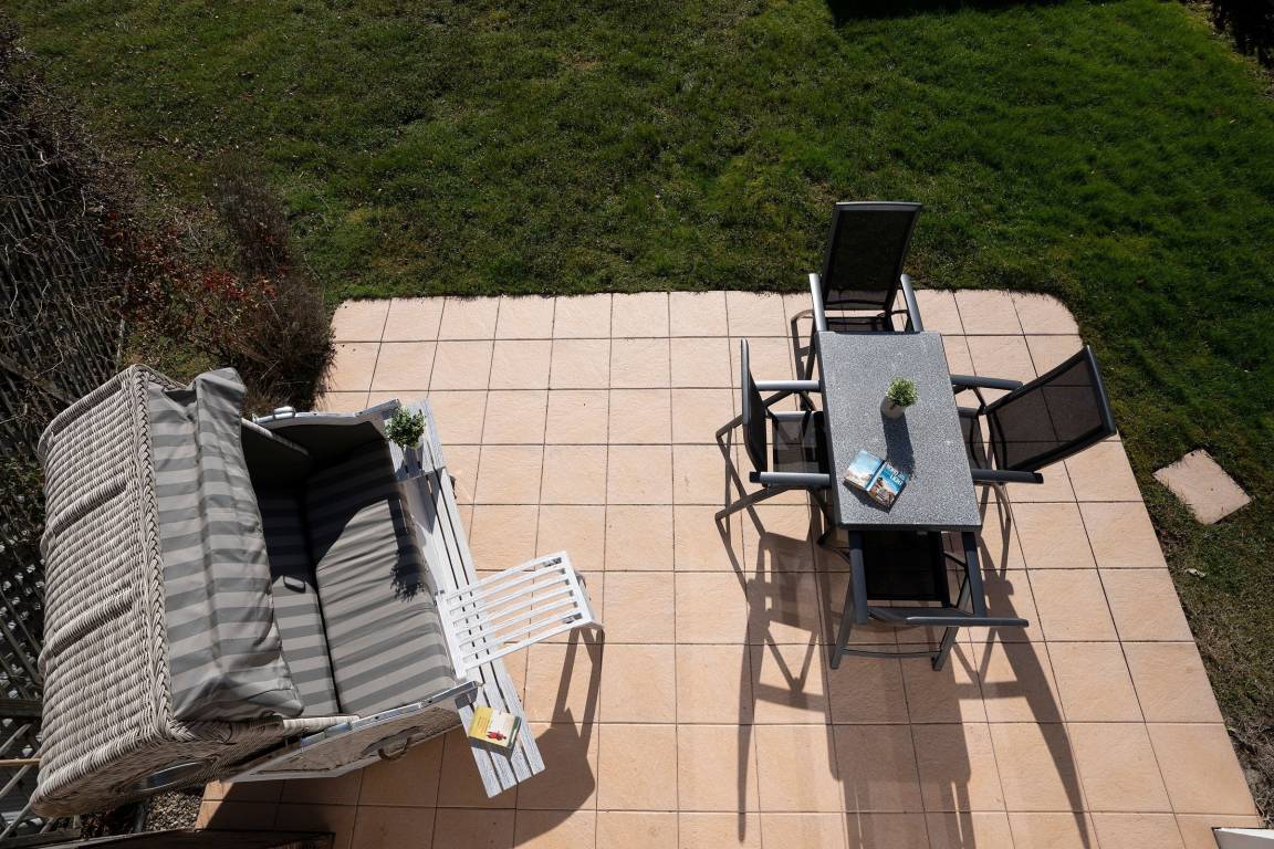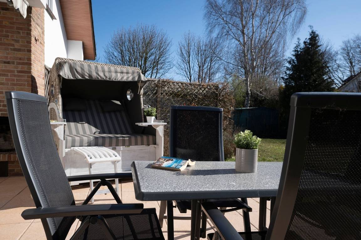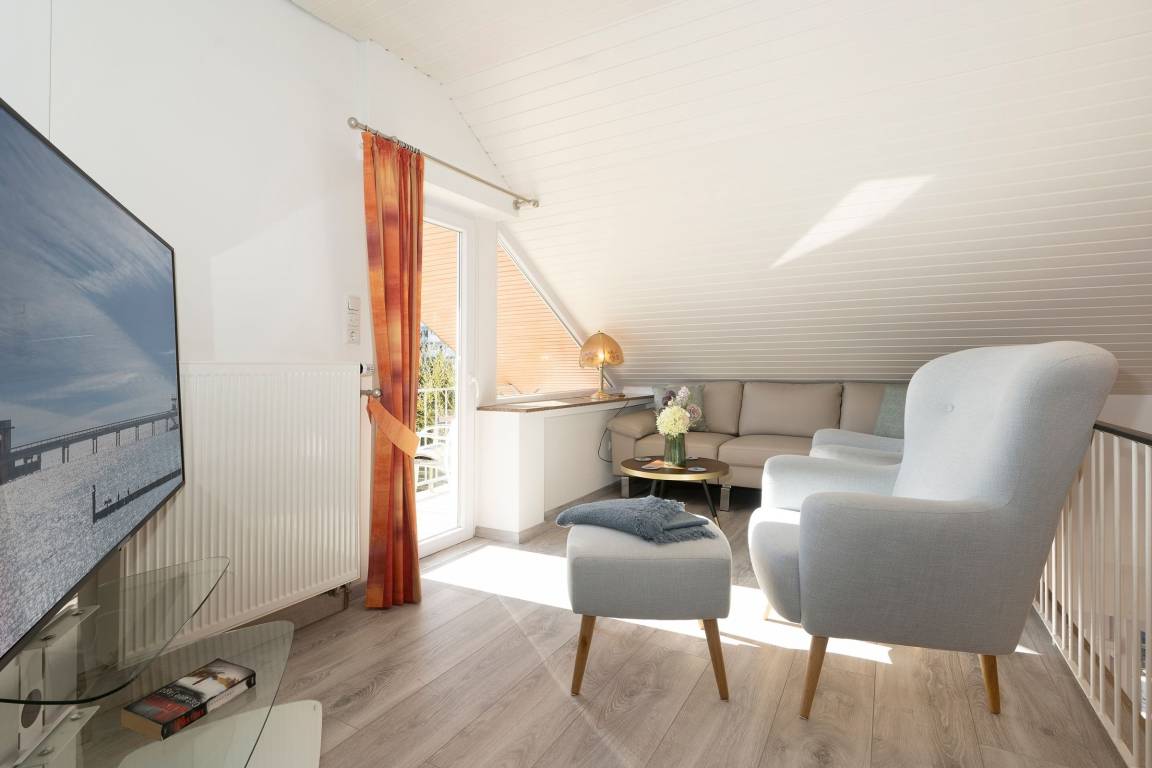 Diese gemütlich eingerichtete Ferienwohnung empfängt Sie direkt im Erdgeschoss gelegenen Wohnbereich mit großzügigem Essbereich und Zugang zur möblierten Süd-West-Terrasse mit eigenem Strandkorb. Direkt nebenan befindet sich die umfassend ausgestattete Küche, in der Sie sich im Urlaub gut selbst versorgen können. Die Treppe führt Sie in die obere Etage, wo sich auch die beiden Schlafzimmer befinden. Hier stehen zwei Einzelbetten (80x200 cm) und ein Doppelbett (2x 90x200 cm) für die Erholung zur Verfügung. Das Wohnzimmer mit eigenem Balkon, Smart-TV und gemütlichem Sofa befindet sich auch auf dieser Etage. Das Tageslichtbad umfasst neben einer bodengleichen Dusche unter anderem einen beheizbaren Handtuchhalter für das Urlaubsgefühl.