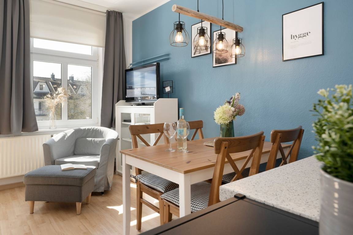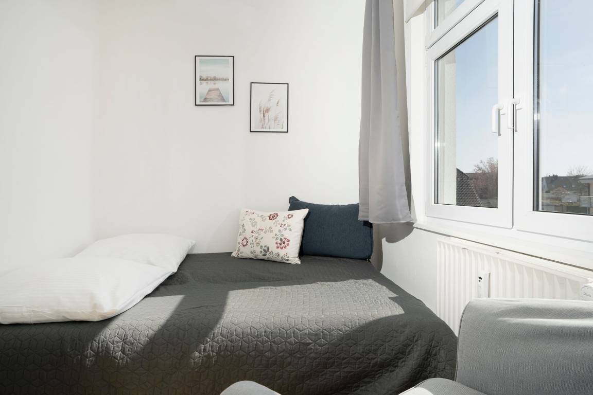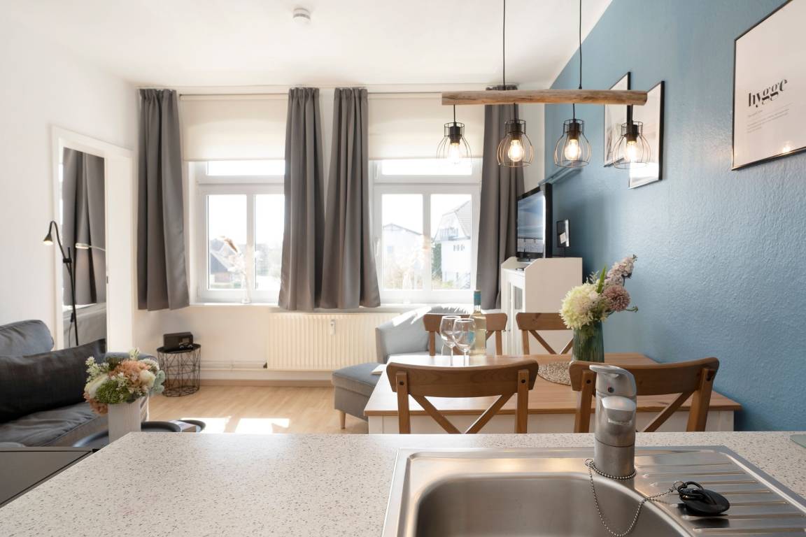 Klein und fein – durch ein durchdachtes Wohnkonzept punktet die Wohnung Strandoase in der gepflegten Wohnanlage Villa Hoffnung. Im Wohn- und Essbereich erwartet Sie eine komfortable Sitz-Ecke mit TV-Gerät sowie eine gemütliche Ess-Ecke. Die gut ausgestattete Küche mit Geschirrspüler ist offen gestaltet und bietet sämtliche Annehmlichkeiten, die ein Hobby-Koch im Urlaub braucht. Ein kleiner Tresen fungiert als Raumteiler und sorgt so für eine angenehme Atmosphäre. Nach einem herrlichen Urlaubstag an der Ostseeküste stehen Ihnen für die Nacht 3 Schlafräume zur Verfügung: In einem Zimmer befindet sich eine Schlafcouch (ca. 140x200 cm) für eine Person und in einem weiteren Zimmer steht ein bequemes Doppelbett (2x 90x200 cm). Von hier aus haben Sie Zugang zu einem weiteren kleinen Schlafraum mit einem Einzelbett (90x200 cm). Das Duschbad ist modern und komfortabel.
