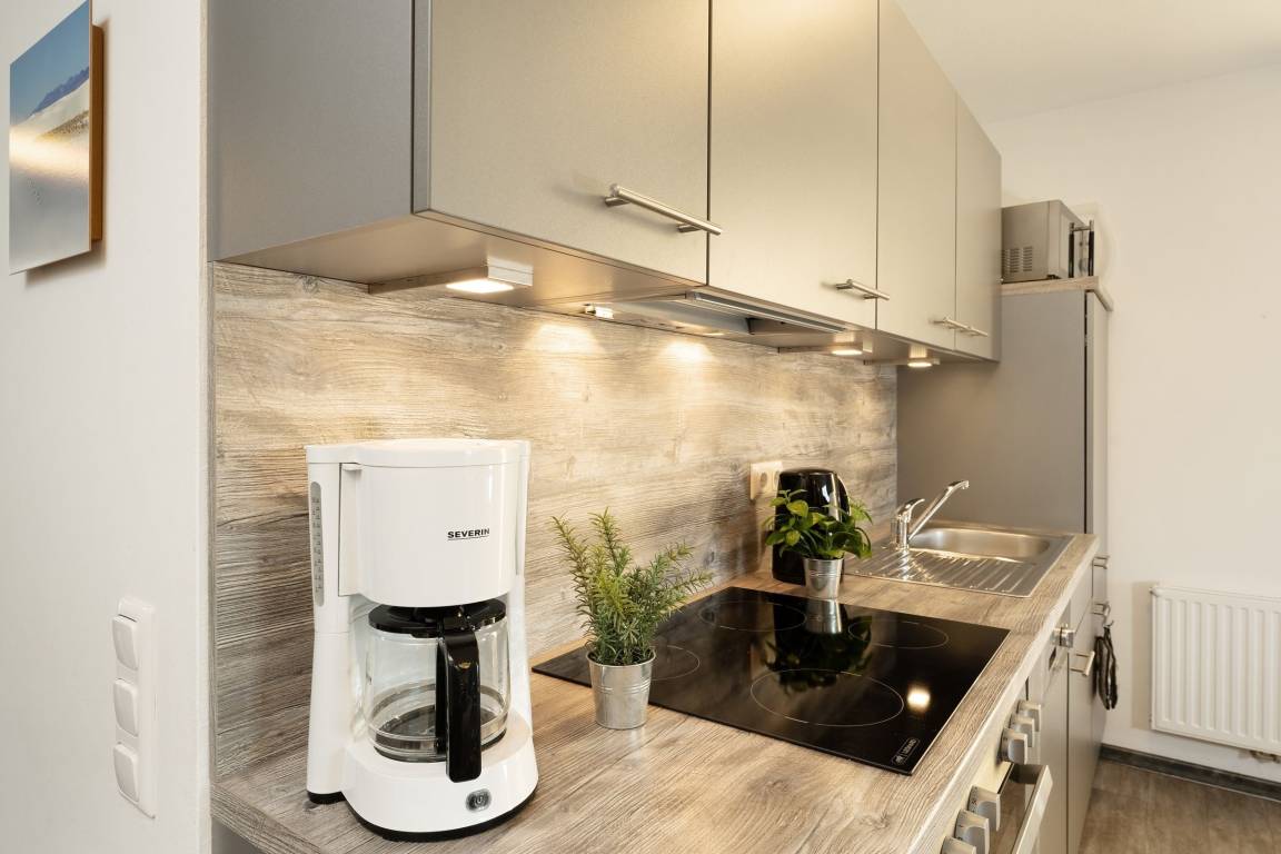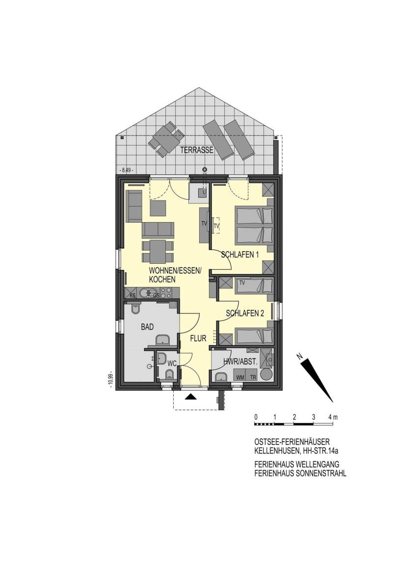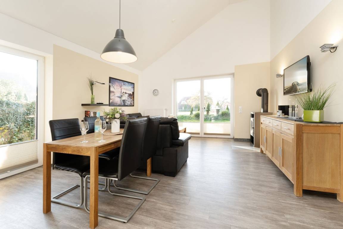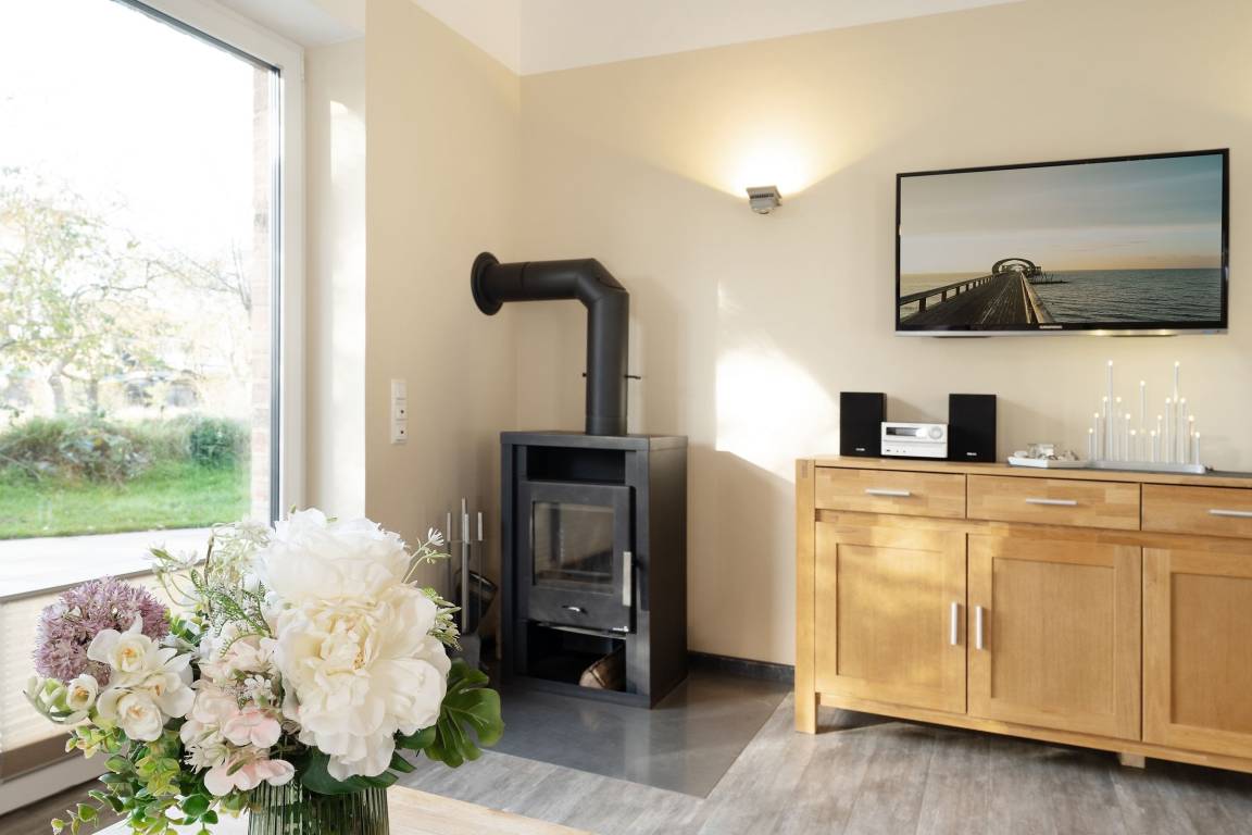 Ein Ferienobjekt der Extraklasse. Hier begrüßt Sie das moderne Haus Wellengang – und sein Name verrät es schon fast: Die Ostsee ist nur rund 200 Meter entfernt. Nehmen Sie im lichtdurchfluteten Wohnbereich Platz. Die beiden Sofas vor dem TV-Gerät laden zum Kuscheln und Relaxen ein, ein Kaminofen sorgt an kühleren Tagen für eine Extra-Portion Gemütlichkeit. Die große Glasfront bietet einen schönen Blick auf die Süd-Terrasse und den Garten. Hier warten eine Sitz-Ecke sowie Sonnenliegen auf Sie. Genießen Sie das gute Wetter, natürlich darf hier auch gern gegrillt werden. Wer im Urlaub lieber seine Lieblings-Speisen kocht, wird sich sicher über die moderne, gut ausgestattete Küche mit Geschirrspüler freuen, die im Wohnraum integriert ist. Gleich dabei befindet sich eine schicke Ess-Ecke. Für die Nacht stehen Ihnen 2 Schlafräume zur Verfügung: Ein Raum ist mit einem Doppelbett (2x 90x200 cm) und einem TV-Gerät ausgestattet. Praktisch: Hier haben Sie auch Zutritt auf die großzügige Terrasse. In dem anderen Raum befinden sich 2 Einzelbetten (je 90x200 cm) sowie ein Wand-TV. Ferner gibt es ein modernes, großzügiges Duschbad mit Fenster und Handtuchwärmer und ein helles Gäste-WC. Waschmaschine und Trockner stehen im Hauswirtschaftsraum zur Verfügung, Kinder-Reisebettchen und Hochstuhl sind ebenfalls vorhanden.