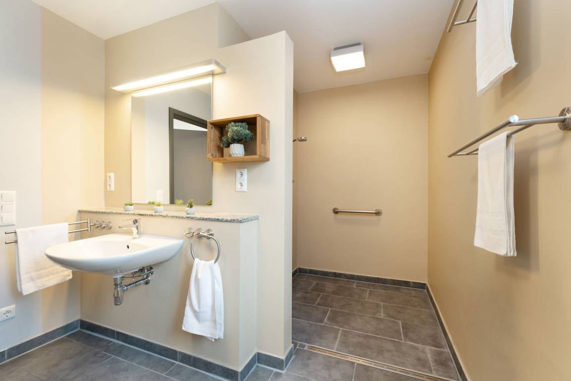 „Sehr großzügige und geräumige Zimmer, alles wie angepriesen "barrierefrei". Es war alles vorhanden. In der Küchenausstattung hat nichts gefehlt. Terrasse mit Sitzgruppe, Liegen und Sonnenschirm ebenfalls vorhanden.“