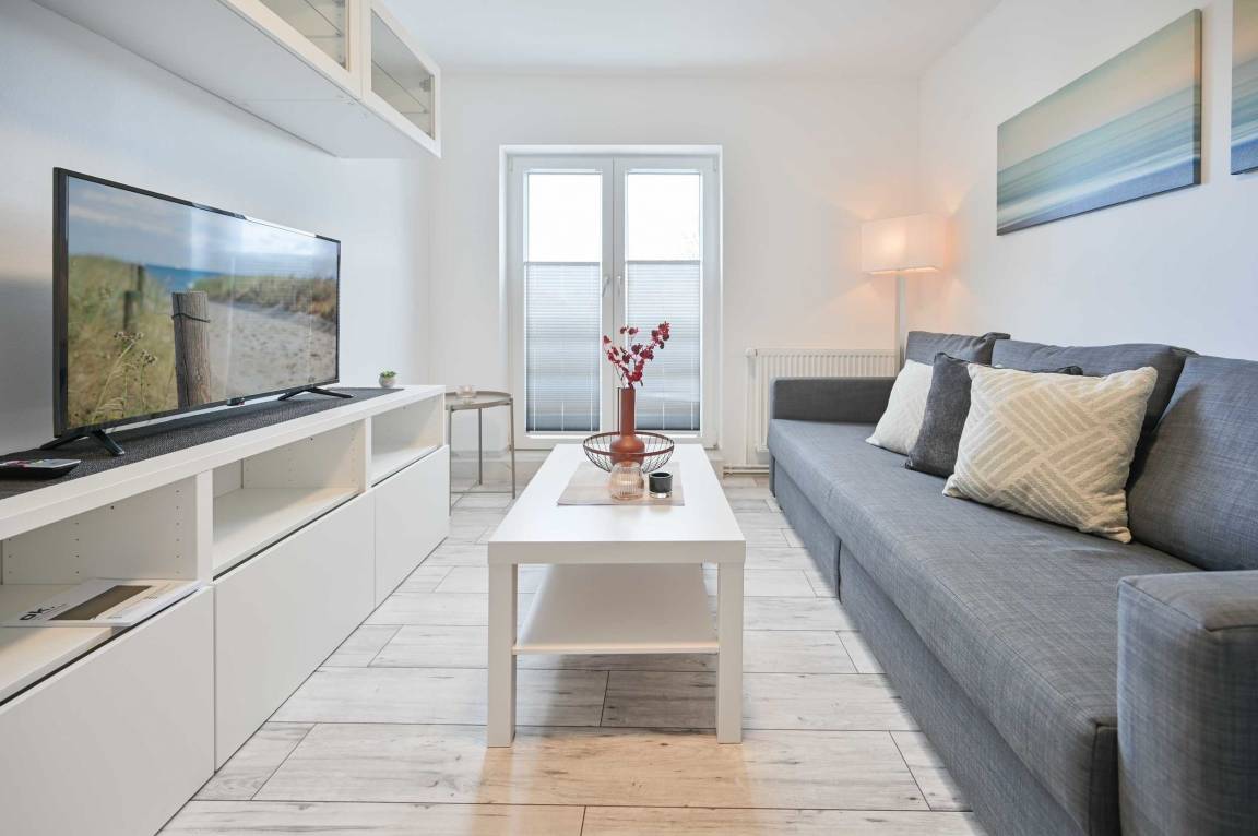 Das Wohnzimmer ist mit einem Schlafsofa, einem Couchtisch, einem TV-Möbel mit Flat-TV sowie einem Esstisch mit 4 Stühlen eingerichtet.