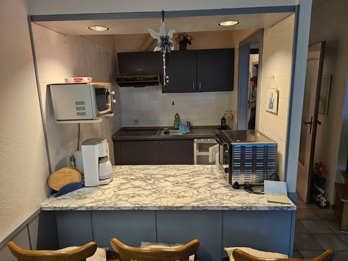Die großzügige Wohnküche beinhaltet alles was man zum alltäglichen Leben braucht. Ein Backofen mit Ceranfeld, eine Mikrowelle, sowie ein Kühlschrank stehen zur Verfügung.