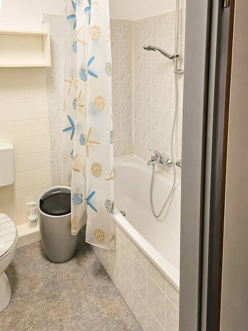 Im Badezimmer befindet sich eine Badewanne mit Duscheinheit, sowie auch ein Haartrockner.