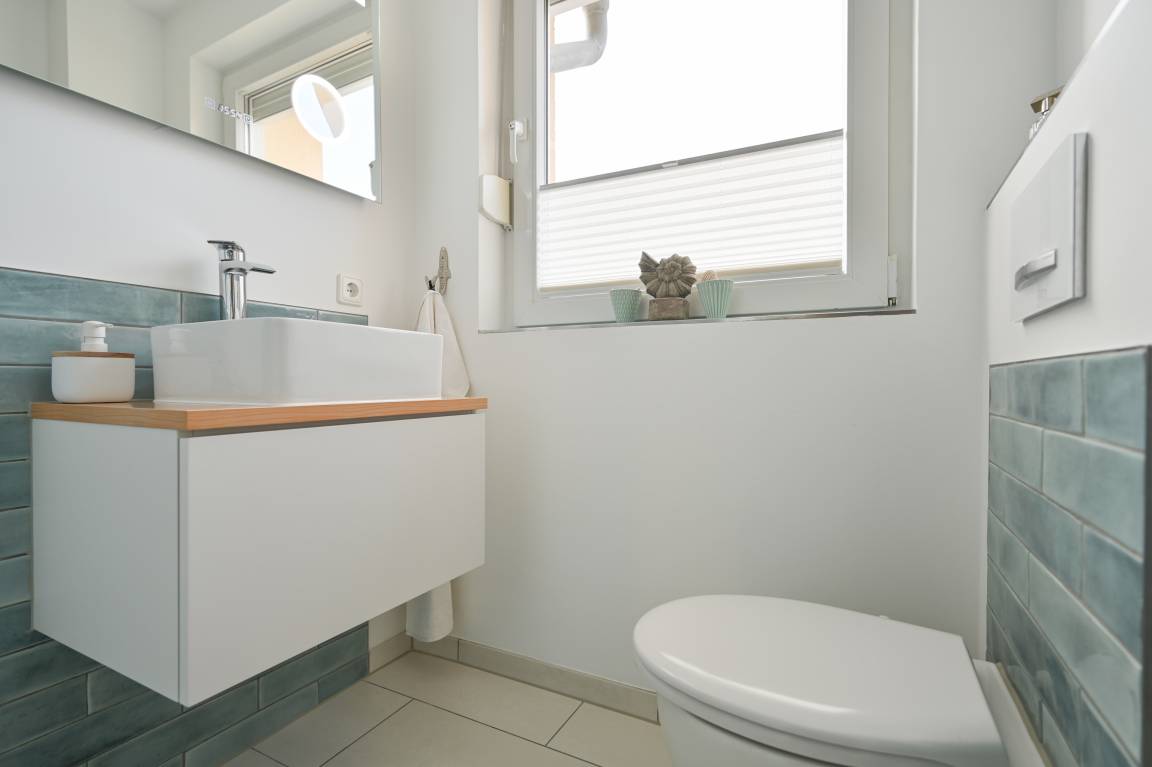 „Das Bad ist sehr schön aber etwas unpraktisch. Fehlende Haken für Handtücher. Fensterrollo hängt sich manchmal fest. Toilettenpapierhalter nur geklebt und fällt somit ab.“