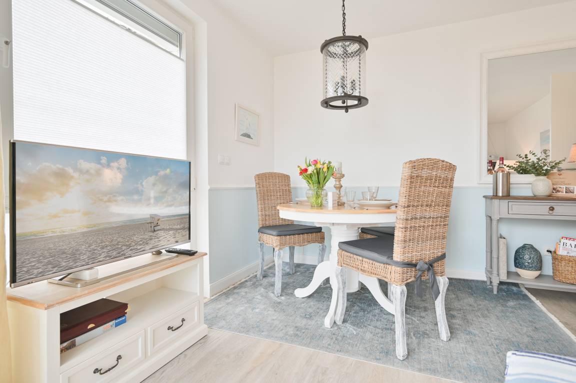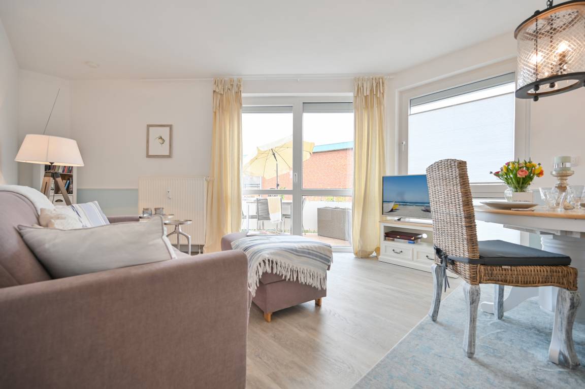 Im Wohnzimmer mit Zugang zum Balkon finden Sie eine hochwertige Schlafcouch (160x200) mit Fußteil, einen gemütlichen Essbereich, sowie ein TV-Möbel mit Flachbild-TV. Ein Bluetoothradio, Bücher und Spiele zum zusätzlichen Zeitvertreib sind ebenfalls vorhanden.