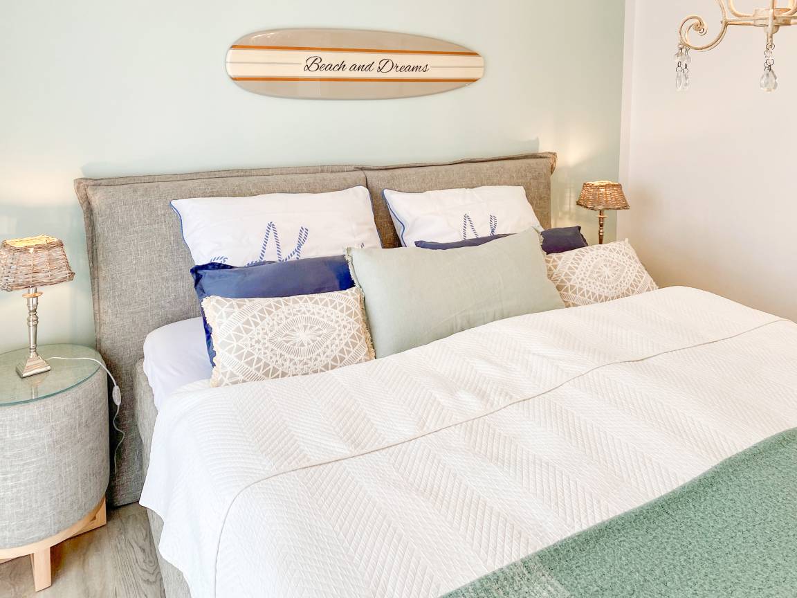 Das separate Schlafzimmer verfügt über ein neues, hochwertiges Boxspringbett, welches bei Ihrer Anreise bereits mit einem frischen Schonbezug bespannt ist. Dazugehörige Nachtschränkchen mit Leseleuchten, ein großzügiger Kleiderschrank sowie ein zweiter Fernseher machen dieses Zimmer komplett.