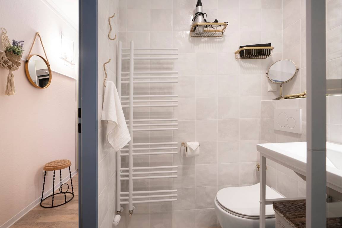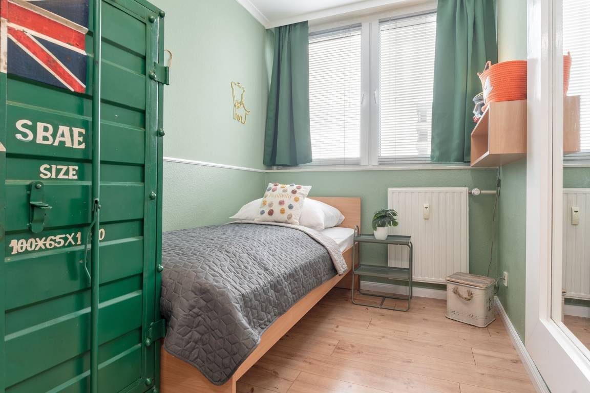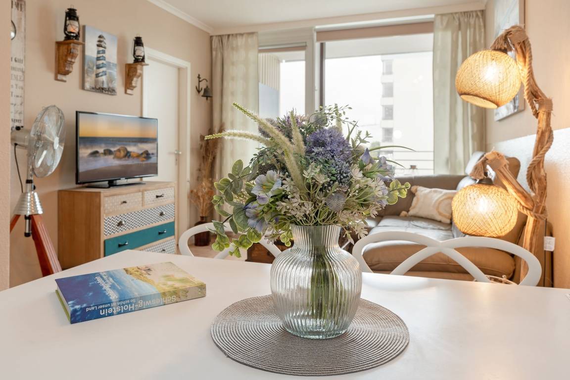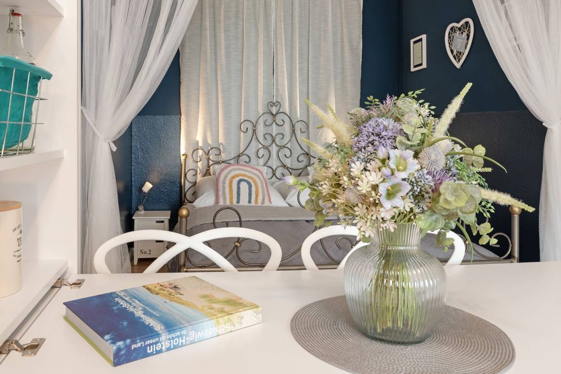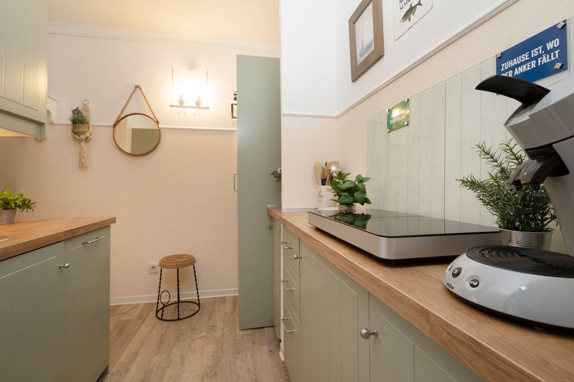 Freundlich und farbenfroh präsentiert sich die Ferienwohnung Wohlfühl-Koje – und der Name ist Programm: Hier werden Sie sich sofort wohlfühlen. Die geschmackvolle, individuelle Einrichtung zaubert sofort gute Laune. Nehmen Sie Platz auf der kuscheligen Sofalandschaft und genießen Sie Ihre Auszeit. Ein Smart-TV sorgt für entsprechende Unterhaltung. Bei schönem Wetter lockt der gemütlich möblierte Süd-West-Balkon gleich nebenan – sicher Ihr neuer Lieblingsplatz, von dem Sie sogar einen seitlichen Blick in Richtung Ostsee genießen können. Freuen Sie sich über die schöne Aussicht und stoßen Sie auf Ihren Urlaub an. Sie haben es sich verdient. Die Küche ist mit einem 2-Platten-Induktionskochfeld, Espressomaschine und Geschirrspüler gut ausgestattet. Bereiten Sie sich hier Ihr leckeres Frühstück zu und schlemmen Sie anschließend in der Ess-Ecke. Für die Nacht steht Ihnen in einer geschützten Nische im Wohn-/Essbereich ein bequemes Doppelbett (160x200 cm) zur Verfügung. Weiterhin befinden sich im separaten Schlafzimmer 2 Einzelbetten (je 90x200 cm). Hier werden Sie garantiert wundervoll von der tollen Ostseeküste träumen. Beide Zimmer bieten übrigens genug Platz, um ein Kinderreisebett aufzustellen. Das bunte Duschbad mit Handtuchwärmer garantiert einen munteren Start in den neuen Urlaubstag.