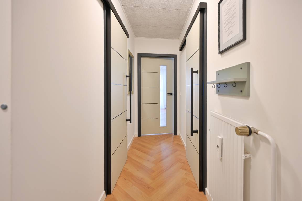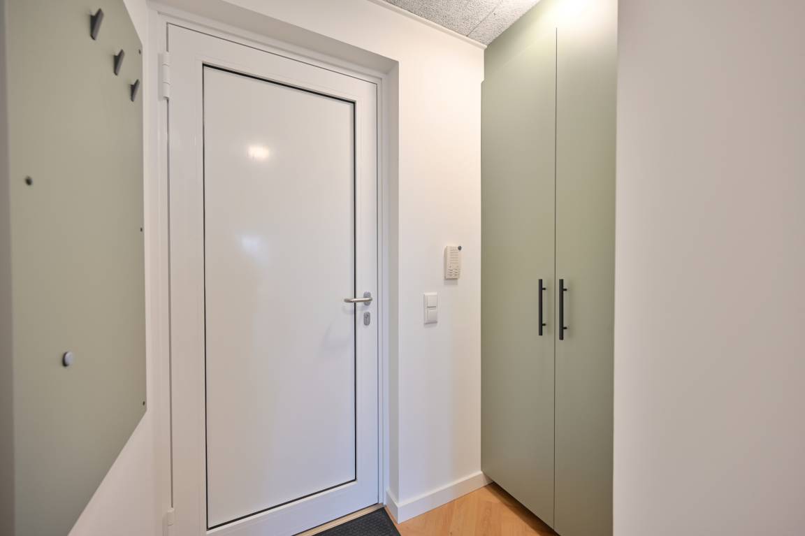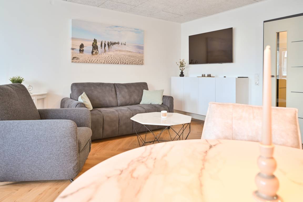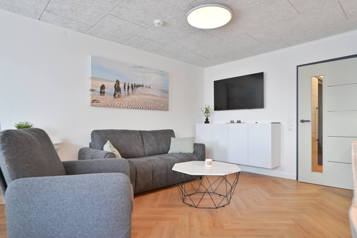 Der Wohnraum ist freundlich gestaltet und hochwertig ausgestattet: Fischgrät-Vinylboden, elegante Innentüren und Schiebetüren sowie ausgewählte Möbel schaffen eine ruhige, moderne Atmosphäre. Ein 55-Zoll-TV, ein bequemes 2er-Sofa und zwei Relax-Sessel laden zum Abschalten ein. Dazu passt der Couchtisch mit Steinoptik – klar, stilvoll, pflegeleicht.