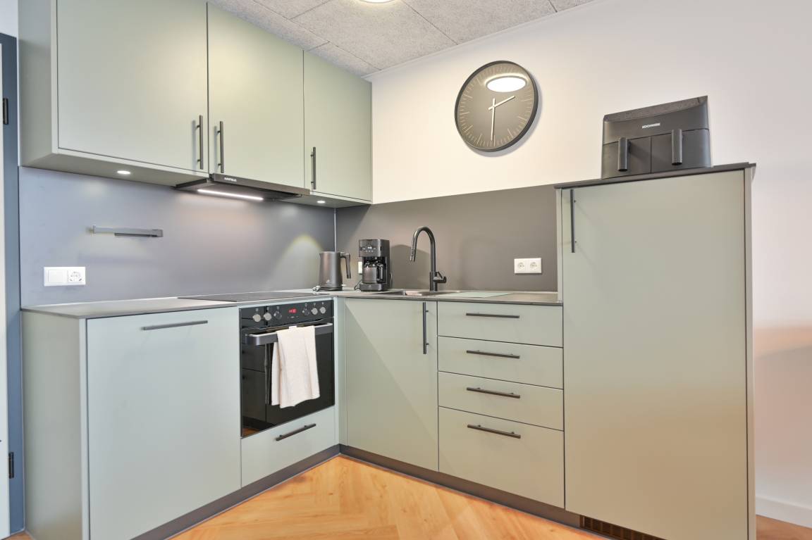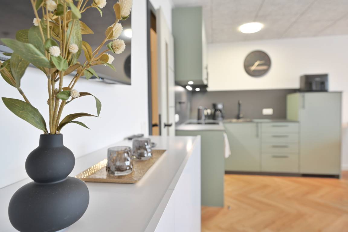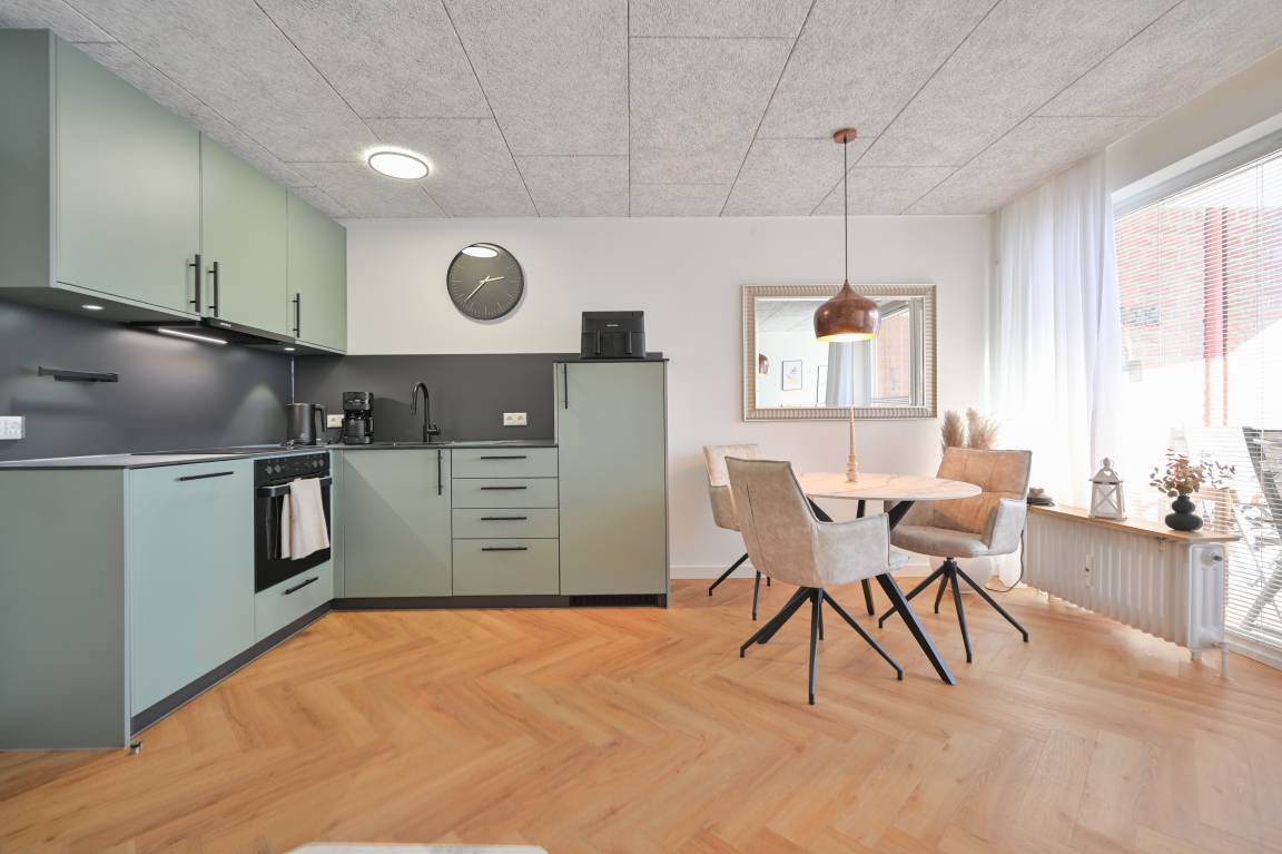 Die Küche überzeugt mit schwarzer Arbeitsplatte und Fronten in einem eleganten Eukalyptus-Ton. Sie ist vollständig ausgestattet – inklusive Geschirrspüler, Backofen und Ceranfeld. Für kleine Extras ist ebenfalls gesorgt, zum Beispiel mit einer Heißluftfritteuse für knusprige Brötchen oder schnelle warme Snacks.