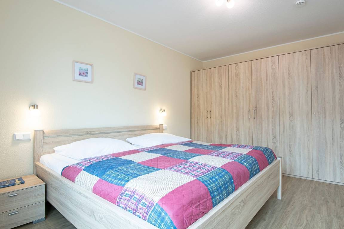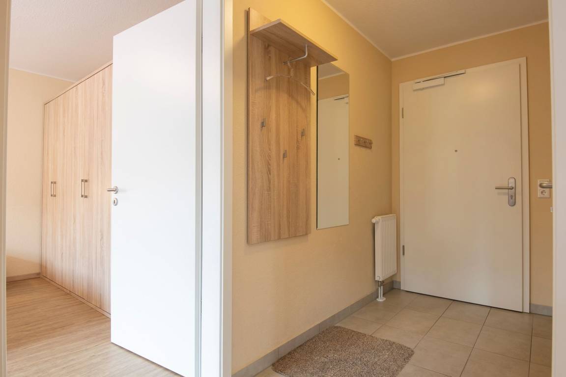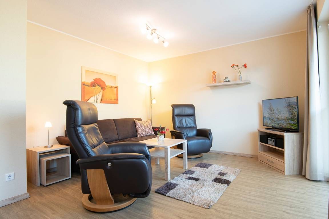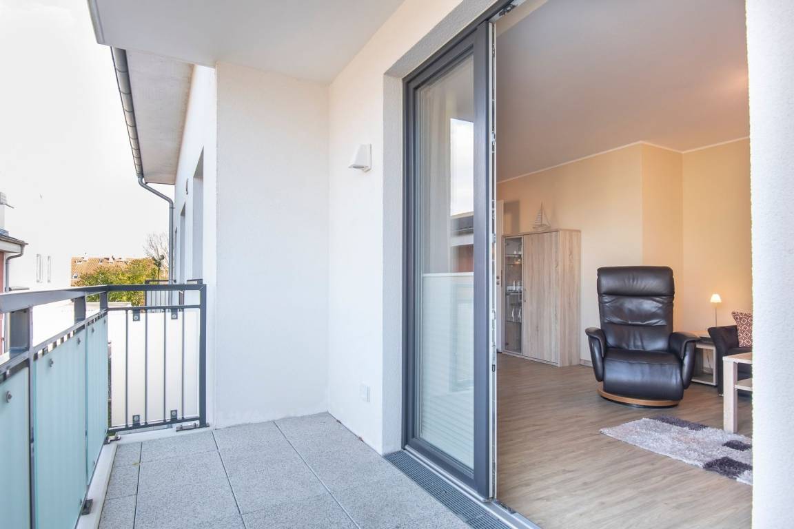 Eine schicke Ferienwohnung begrüßt Sie mit großzügigem Wohn- und Essbereich. Die gemütliche Sofaecke mit Fernseher garantiert entspannte Stunden nach erlebnisreichen Urlaubstagen. Treten Sie raus auf den möblierten Balkon mit westlicher Ausrichtung, auf dem Sie die letzten Sonnenstrahlen des Tages bei einem Glas Wein genießen können. Die an den Wohnbereich angrenzender Einbauküche ausgestattet mit Ceranfeld und Backofen, Mikrowelle, Geschirrspüler, Kaffeemaschine etc. lädt zu geselligen Kochabenden ein. Im separaten Schlafzimmer mit Doppelbett (2x 100x200 cm) in Komforthöhe, Fernseher und franz. Balkon verbringen Sie ruhige Nächte. Das geräumige Duschbad mit bodentiefer Dusche, Fußbodenheizung, beheizbaren Handtuchhalter und zusätzlichem Abstellraum rundet das Angebot der Wohnung ab. Der WLAN-Anschluss ist inklusive.